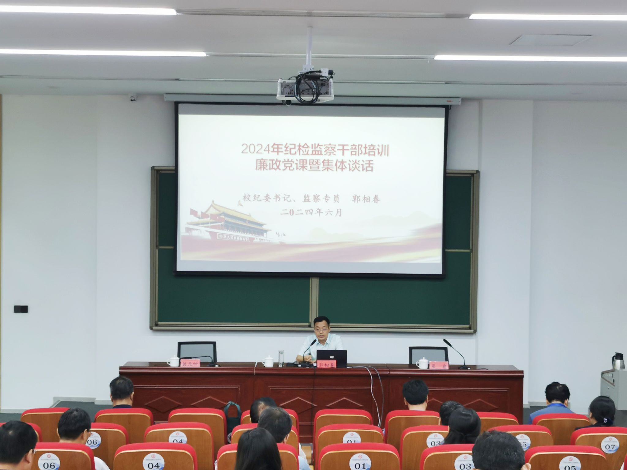 开班式上,郭相春为全体纪检监察干部讲授专题廉政党课并进行集体谈话。他表示,举办这次培训是深入学习贯彻二十届中央纪委三次全会、十一届省纪委四次全会精神,落实学校党纪学习教育工作部署,加强纪检监察工作干部队伍建设的具体举措,也是落实全省加强基层监督工作推进会议精神的具体行动。全体纪检监察干部要严守政治纪律,看一看政治意识是否坚定、宗旨意识是否减弱、规则意识有无松动,自觉做到对党绝对忠诚;要严守组织纪律,看一看组织观念是否树牢、是否有非组织言行、有无选择性执行情况,自觉做到相信依靠组织;要严守廉洁纪律,看一看廉洁防线是否牢固、公仆意识是否淡化、朋友圈子有无隐患,自觉做到自身干净硬气;要严守群众纪律,看一看群众立场是否站稳、群众意识有无减弱、有无优亲厚友行为,自觉做到维护师生利益;要严守工作纪律,看一看履职尽责是否到位、斗争精神是否保有、力度质效有无保障,自觉做到尽心竭力干事;要严守生活纪律,看一看生活作风是否端正、攀比思想有无苗头、家风家教是否优良,自觉做到廉洁修身齐家。要旗帜鲜明讲政治,以“两个永远在路上”的坚定和执着护航学校高质量发展;要时刻牢记“打铁必须自身硬”,以更高标准、更严要求规范言行举止,增强纪律意识、绷紧纪律之弦;要重点聚焦“一把手”和领导班子,紧盯“三重一大”事项研究决策,做好基层政治监督和对权力运行的监督,打通全面从严治党“最后一公里”;要牢固树立“校党委中心工作就是纪委监督服务保障重点工作”的理念,以“有解”思维攻坚克难,切实维护干事创业风清气正的政治生态,始终为学校事业高质量发展提供坚强的纪律保障!