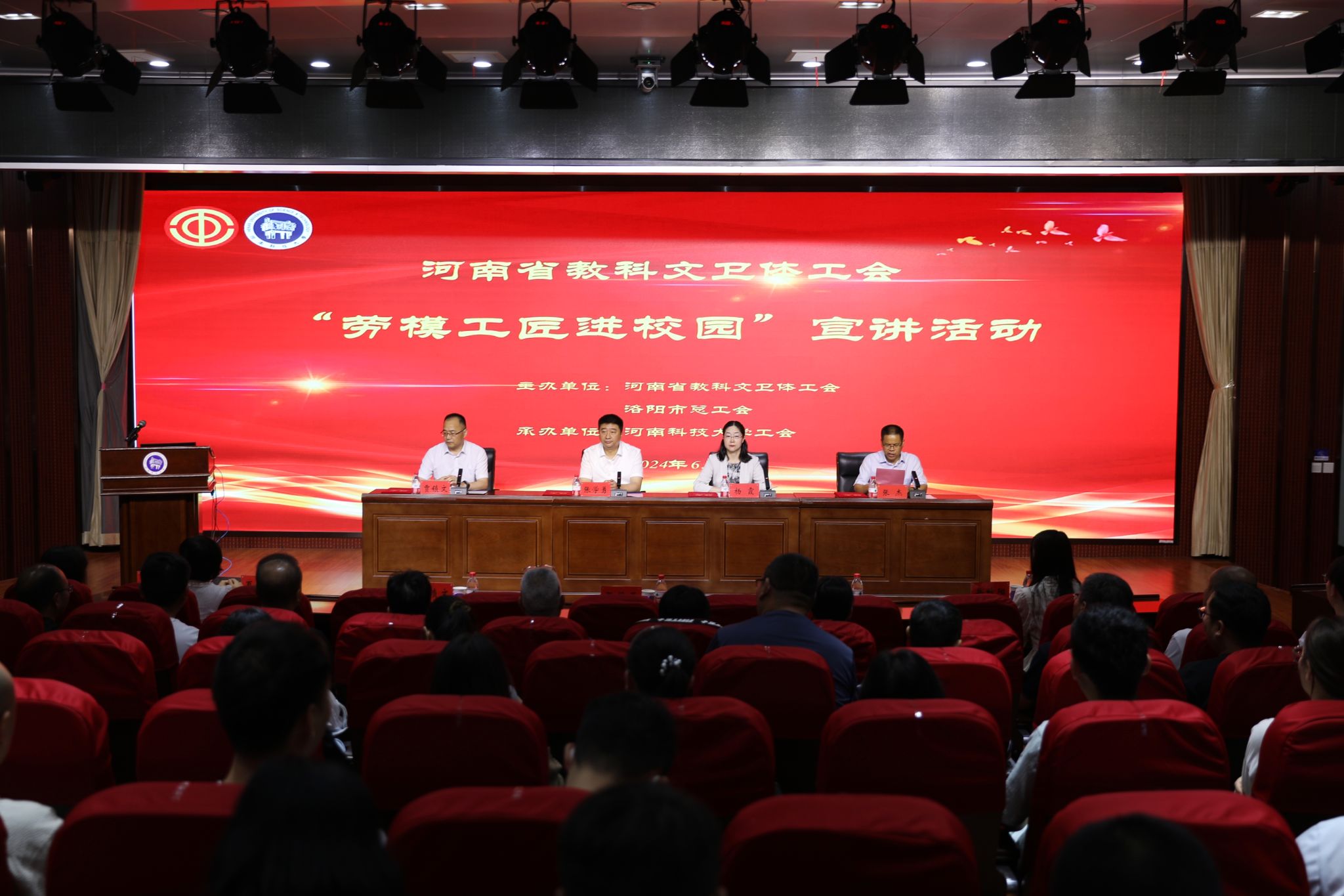 校新闻中心讯 6月20日,河南省教科文卫体工会2024年“劳模工匠进校园”示范宣讲活动暨洛阳市总工会劳模工匠宣讲团聘书颁发仪式在我校举行。河南省教科文卫体工会主席张学勇,洛阳市总工会党组成员、副主席贾锁文,正规博彩平台党委副书记、工会主席杨霞出席活动。