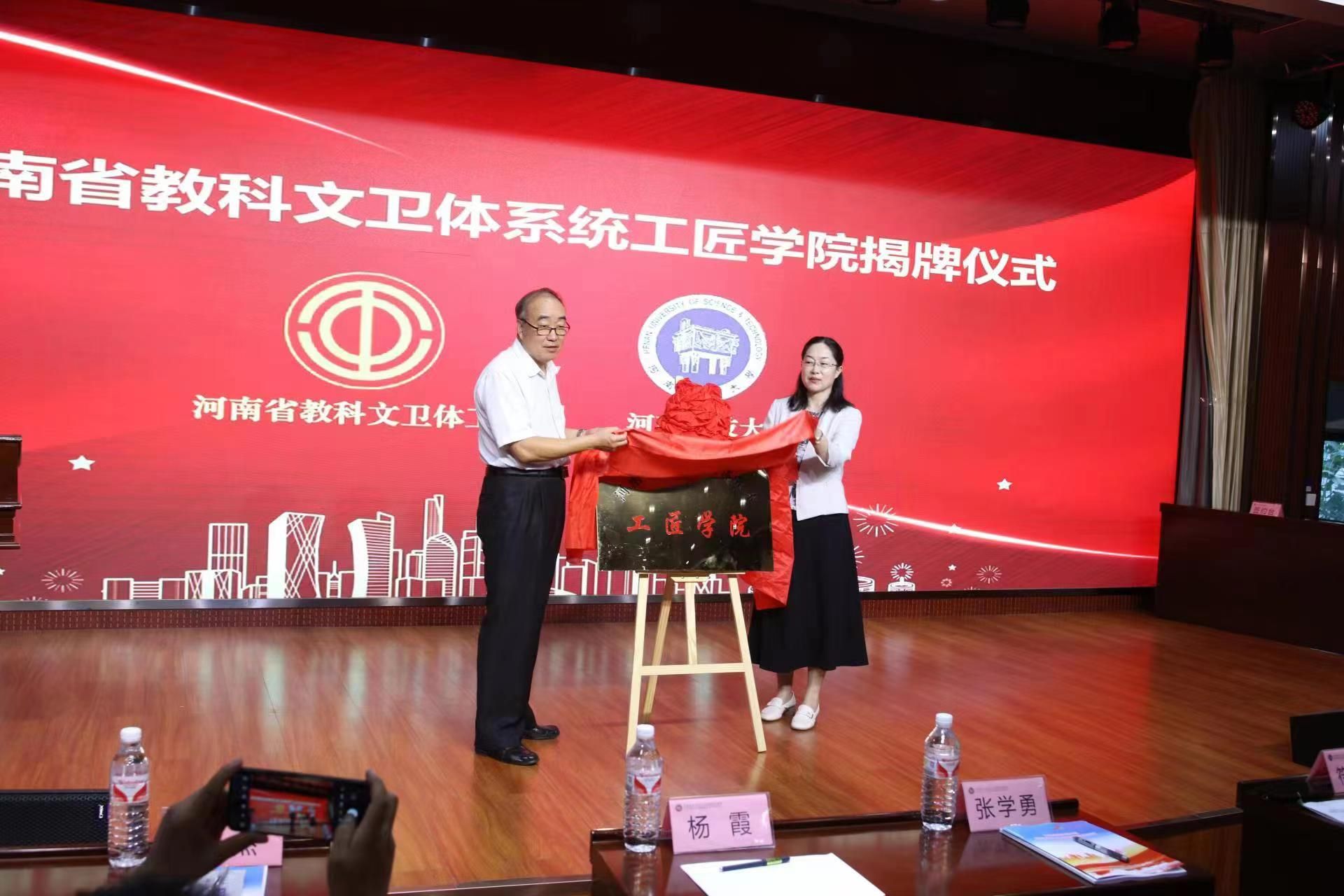 校新闻中心讯 8月1日,河南省教科文卫体工会在我校教师发展中心举行省教科文卫体工会系统工匠学院签约揭牌仪式。河南省总工会二级巡视员符明轩、省教科文卫体工会主席张学勇、省科技厅机关党委副书记马骥,正规博彩平台党委副书记、工会主席杨霞、副校长穆云超出席仪式。签约揭牌仪式由张学勇主持。