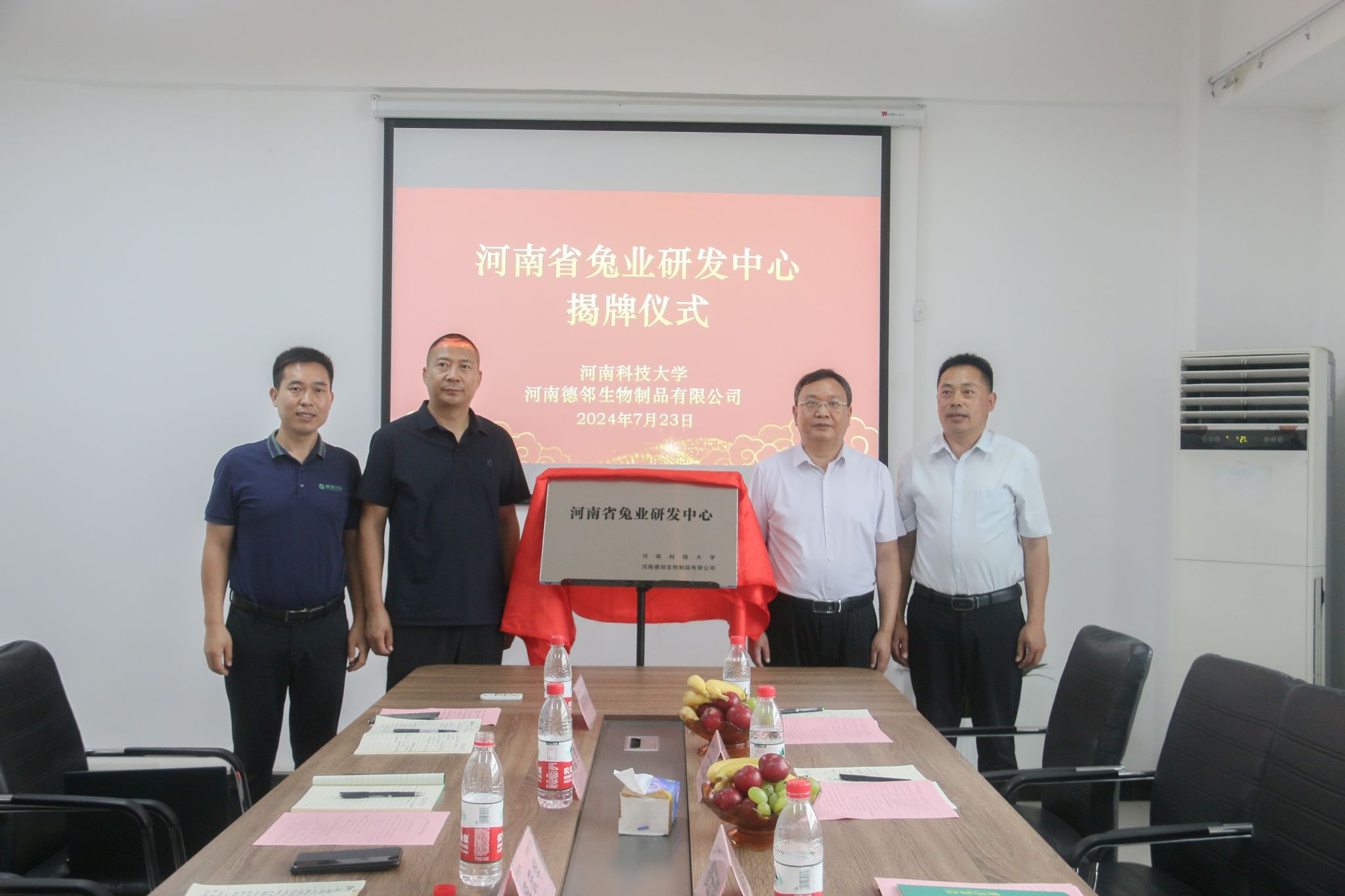 在德邻生物科技有限公司,穆云超与李庆华共同为校企合作平台“河南省兔业研究中心”揭牌。