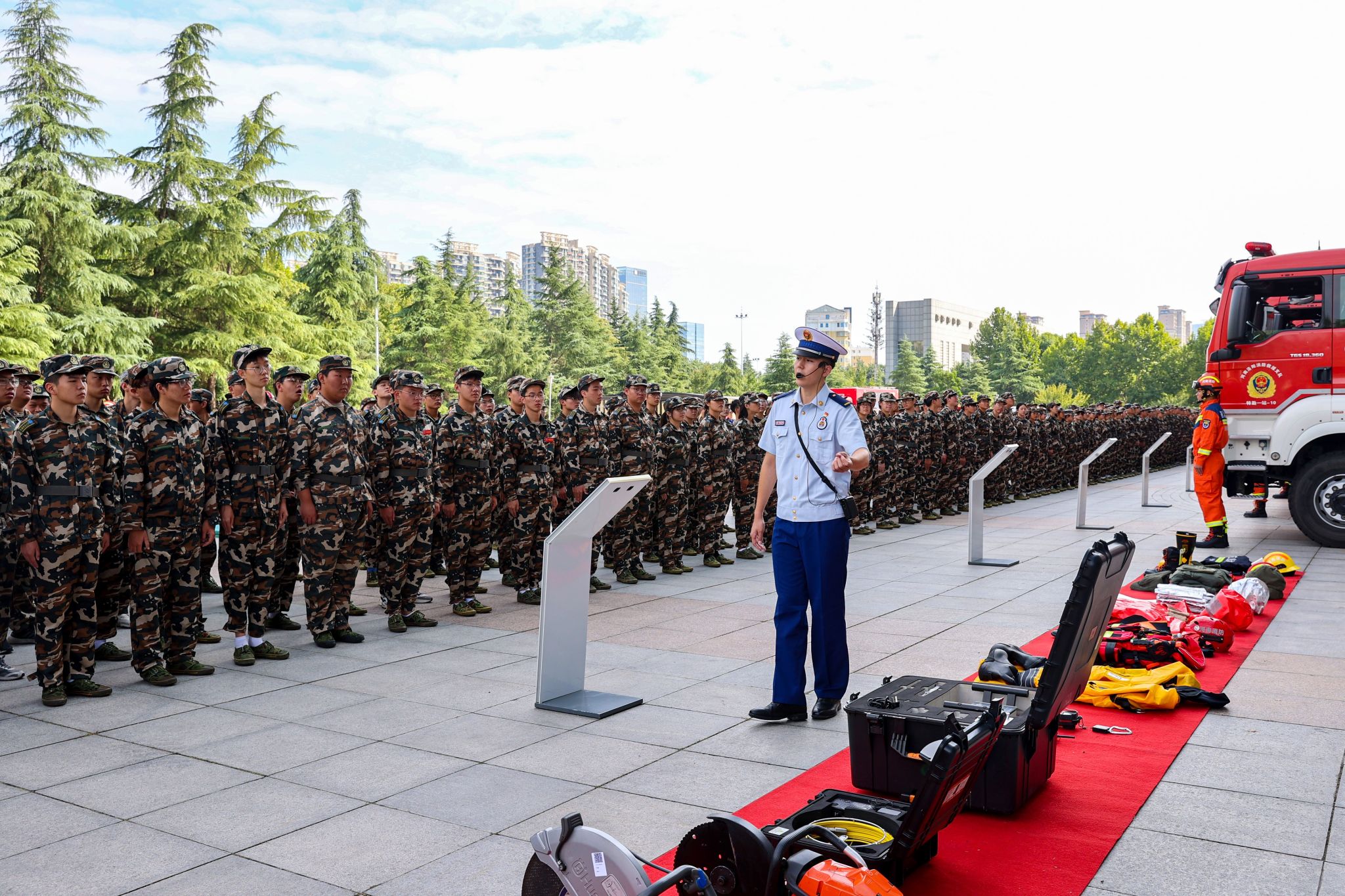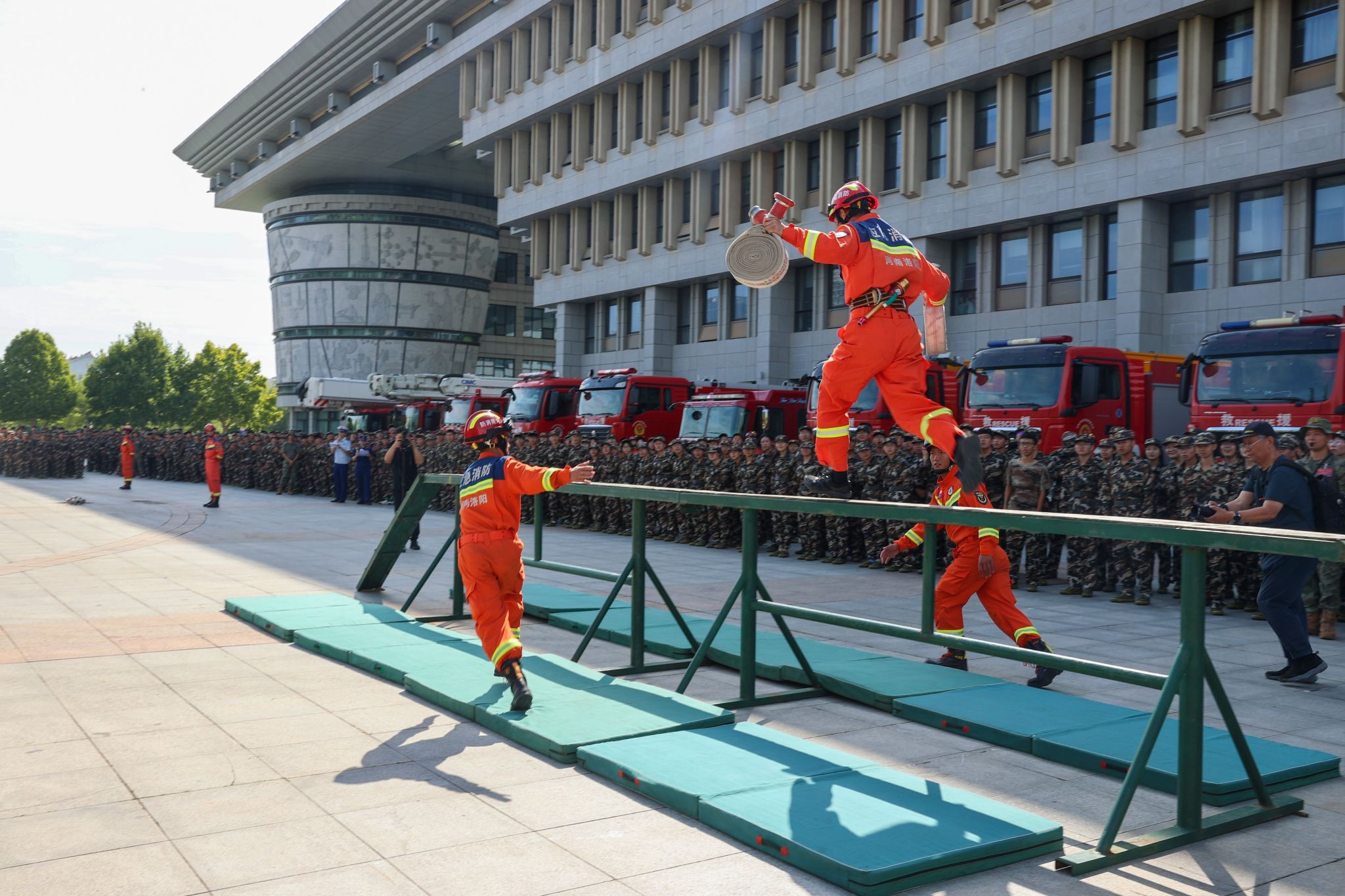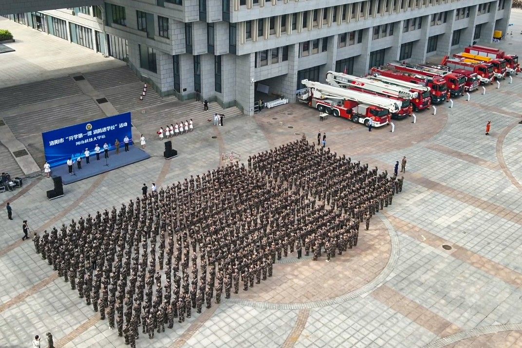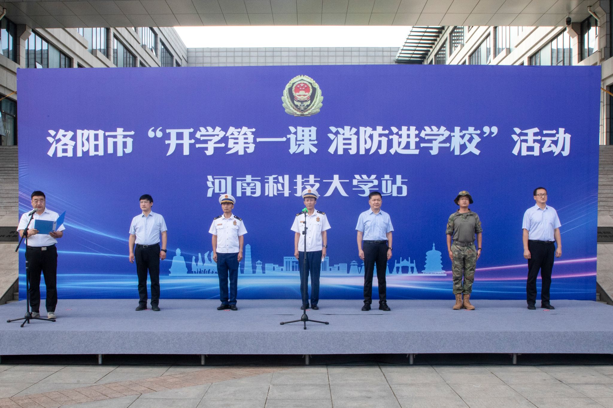 校新闻中心讯 9月12日,洛阳市2024年“开学第一课 消防进学校”活动在我校举行。副校长王学峰、洛阳市消防救援支队支队长李存海、副支队长王海成出席活动。军训承训部队负责人、学校相关职能部门负责人、洛阳市消防救援支队消防救援人员及2024级新生代表共1200余人参加活动。