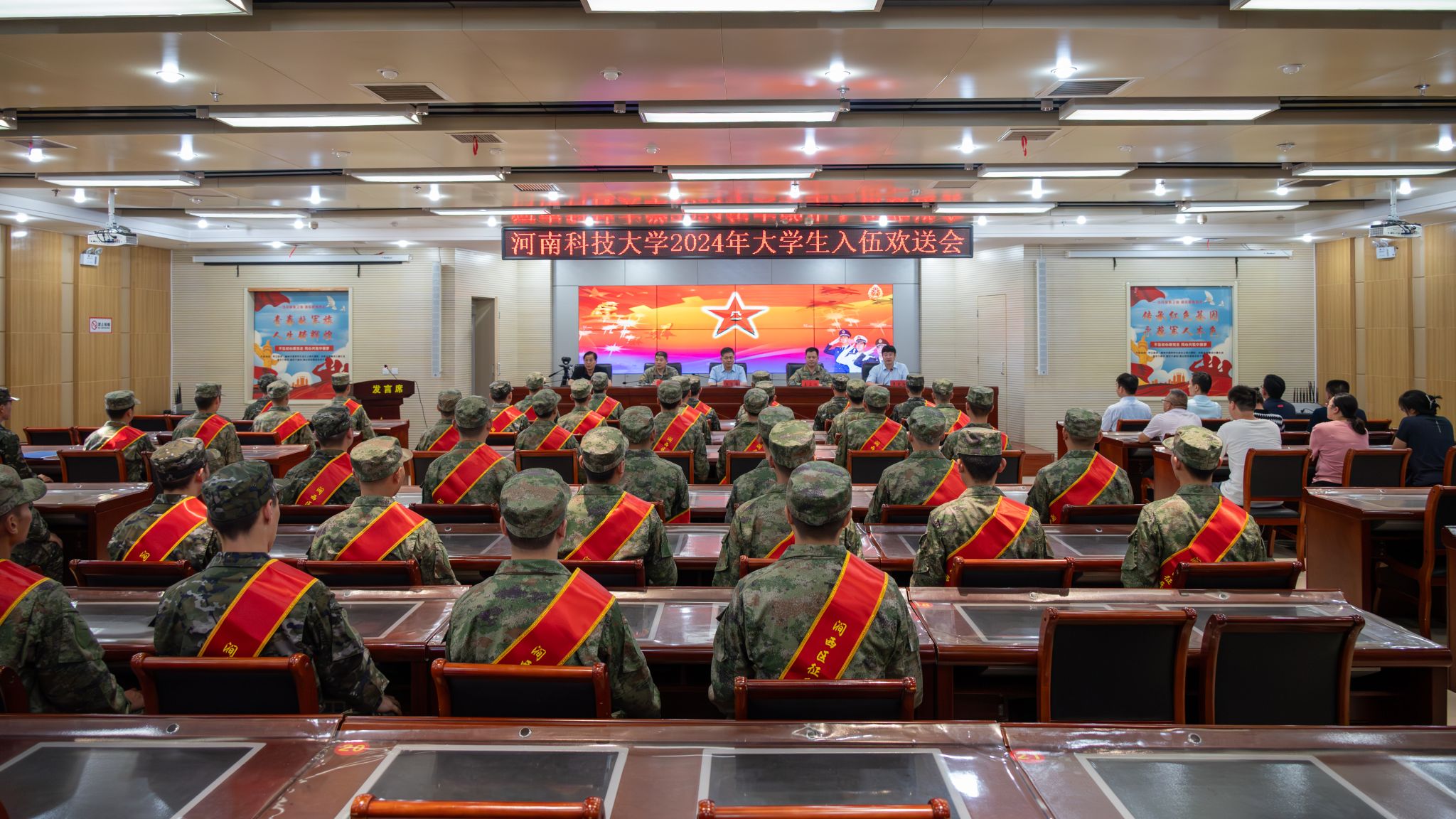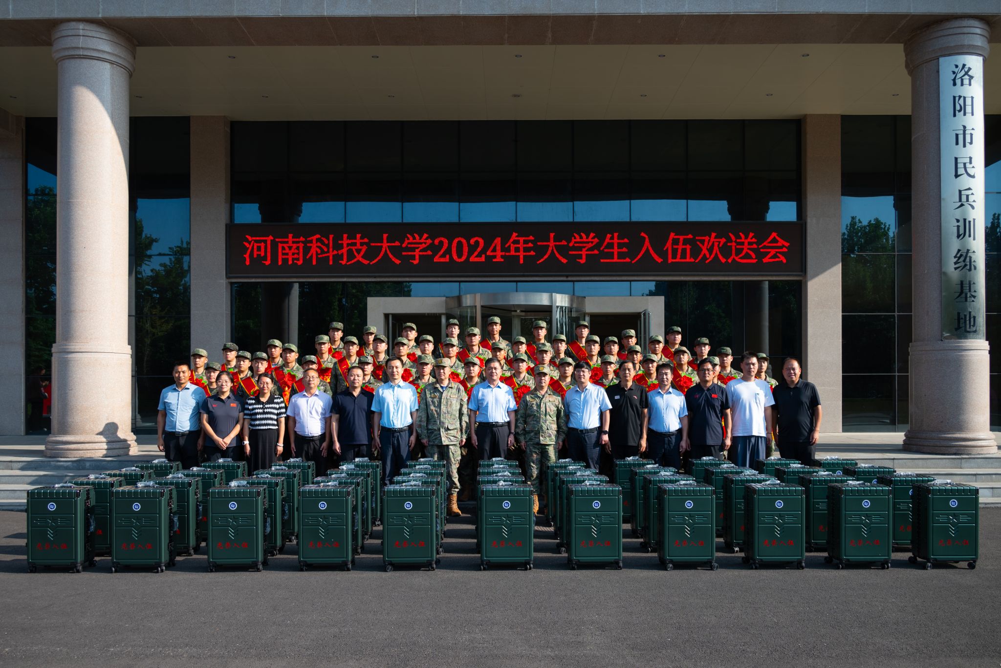 校新闻中心讯 9月16日,正规博彩平台2024年大学生入伍欢送会在洛阳市民兵训练基地举行。副校长王学峰,涧西区武装部部长姜占旭、政委秦绪昌,党委武装部及相关学院负责人参加会议。44名新入伍大学生参加欢送仪式。