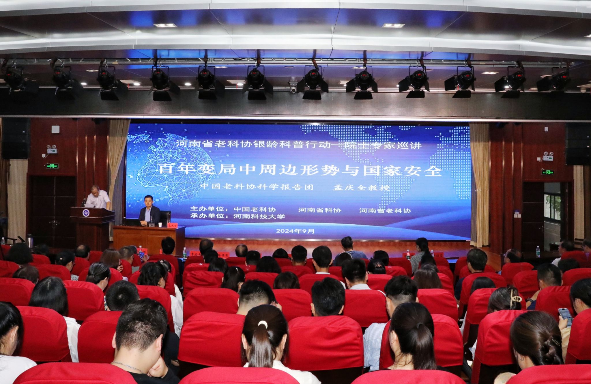本次报告会是由中国老科协、河南省科协、老科协组织开展的2024年老科协银龄科普行动——院士专家巡讲系列活动的一部分,也是我校关工委“月月谈”大讲堂第十一期活动,旨在进一步教育引导广大师生牢固树立“大安全理念”,增强国家安全意识,筑牢国家安全防线。报告会设置了1个主会场和64个直播分会场,我校关工委“五老”委员、老科协会员、马克思主义学院教师、学工干部和全体2024级新生约一万余人共同聆听了报告。