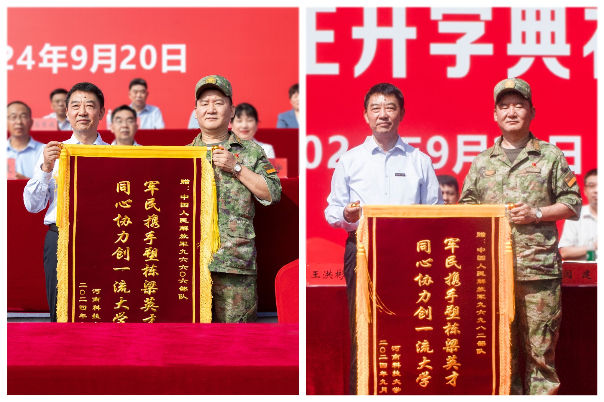 在热烈的掌声中,党委书记、校长王洪彬向承训部队赠送锦旗,感谢承训单位对学校军训工作的大力支持。