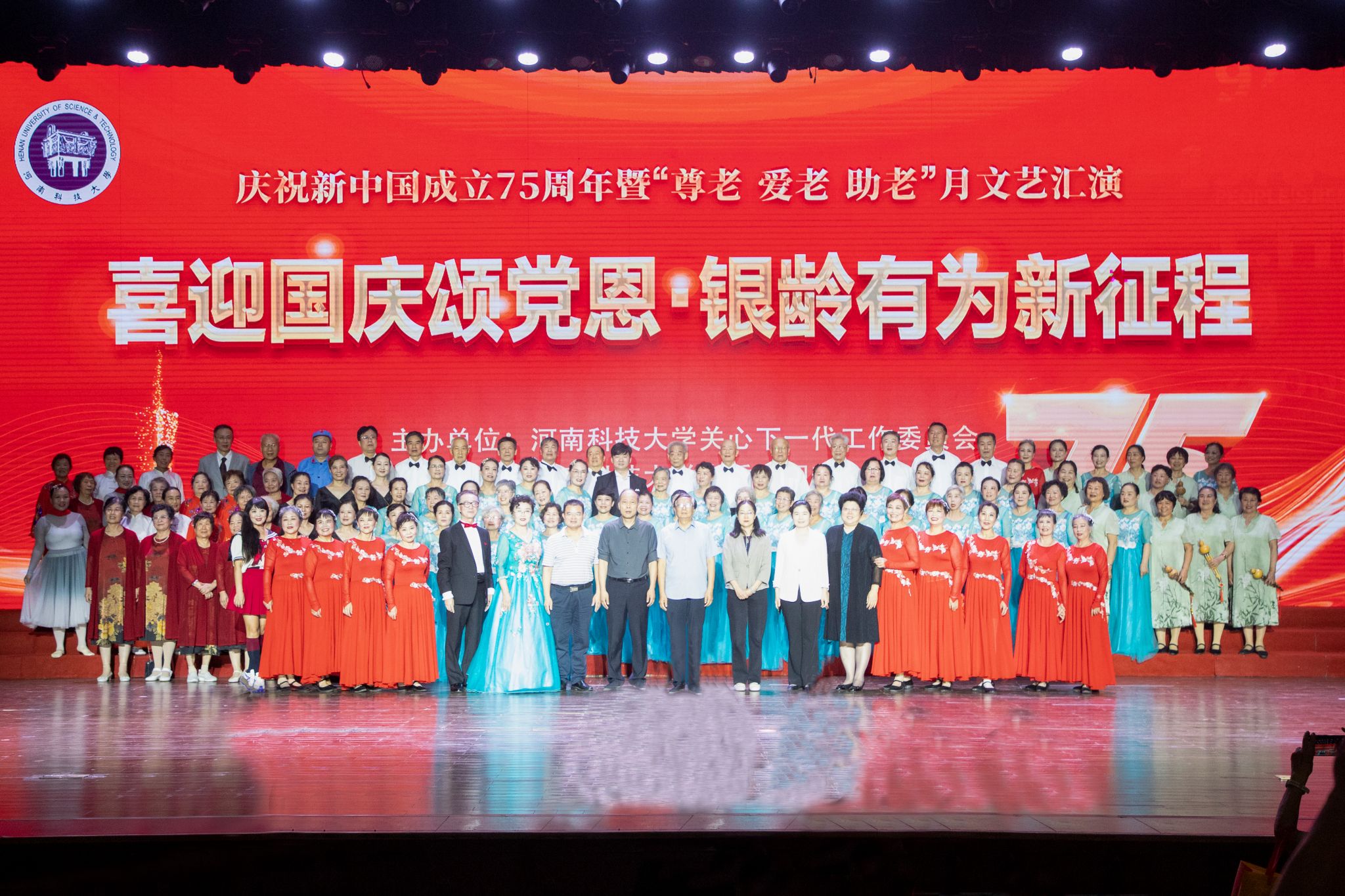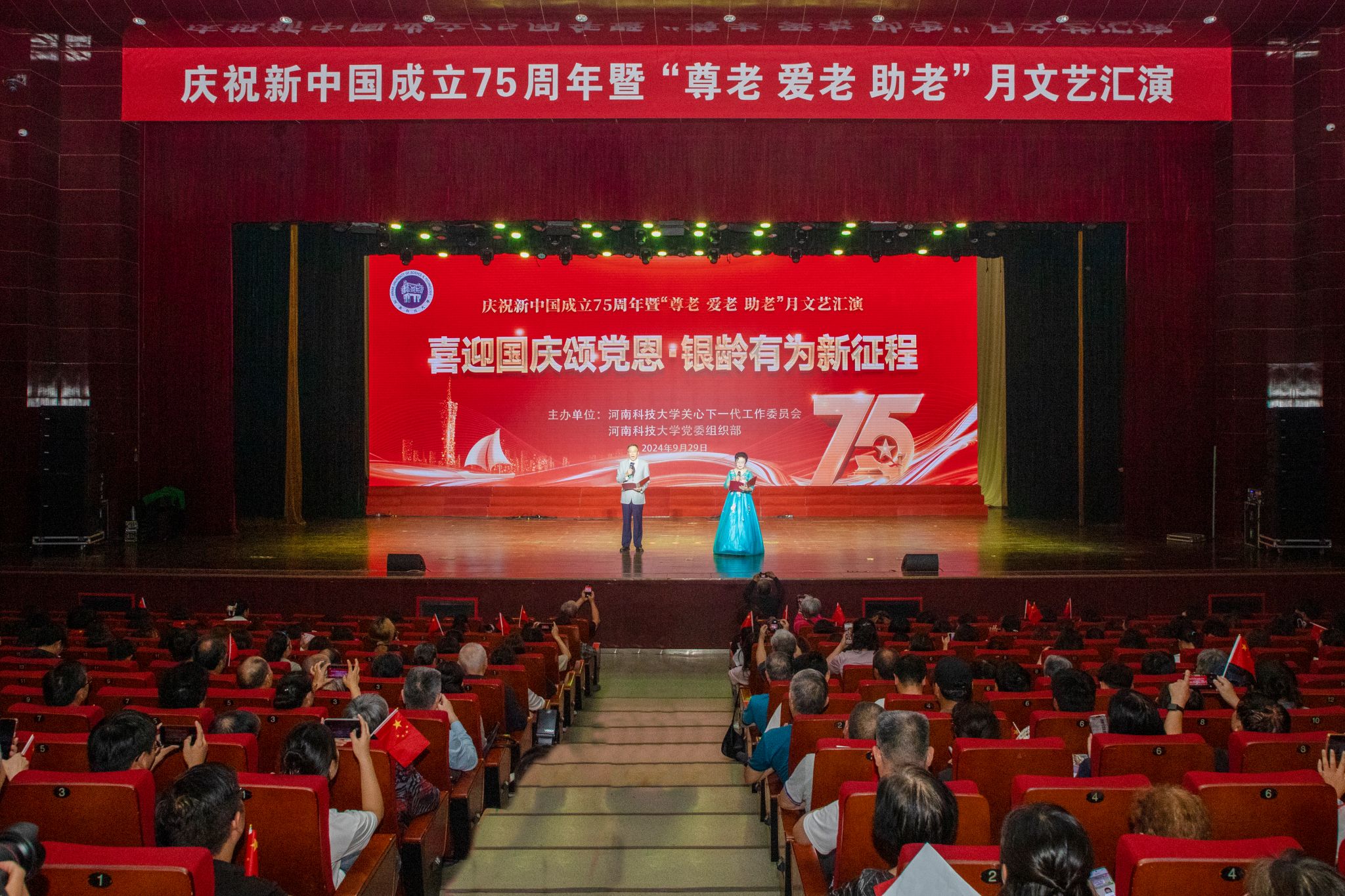 校新闻中心讯 9月29日,学校举办“喜迎国庆颂党恩 银龄有为新征程”——庆祝新中国成立75周年暨“尊老 爱老 助老”月文艺汇演。河南省教育厅关工委副主任高治军,校党委副书记、工会主席、关工委主任杨霞,关工委常务副主任李漪参加活动。相关职能部门、学院(书院),各级关工委“五老”成员、老科协会员以及2024级学生等近千名师生代表欢聚一堂,共同庆祝新中国75周年华诞,迎接第十二个重阳佳节。