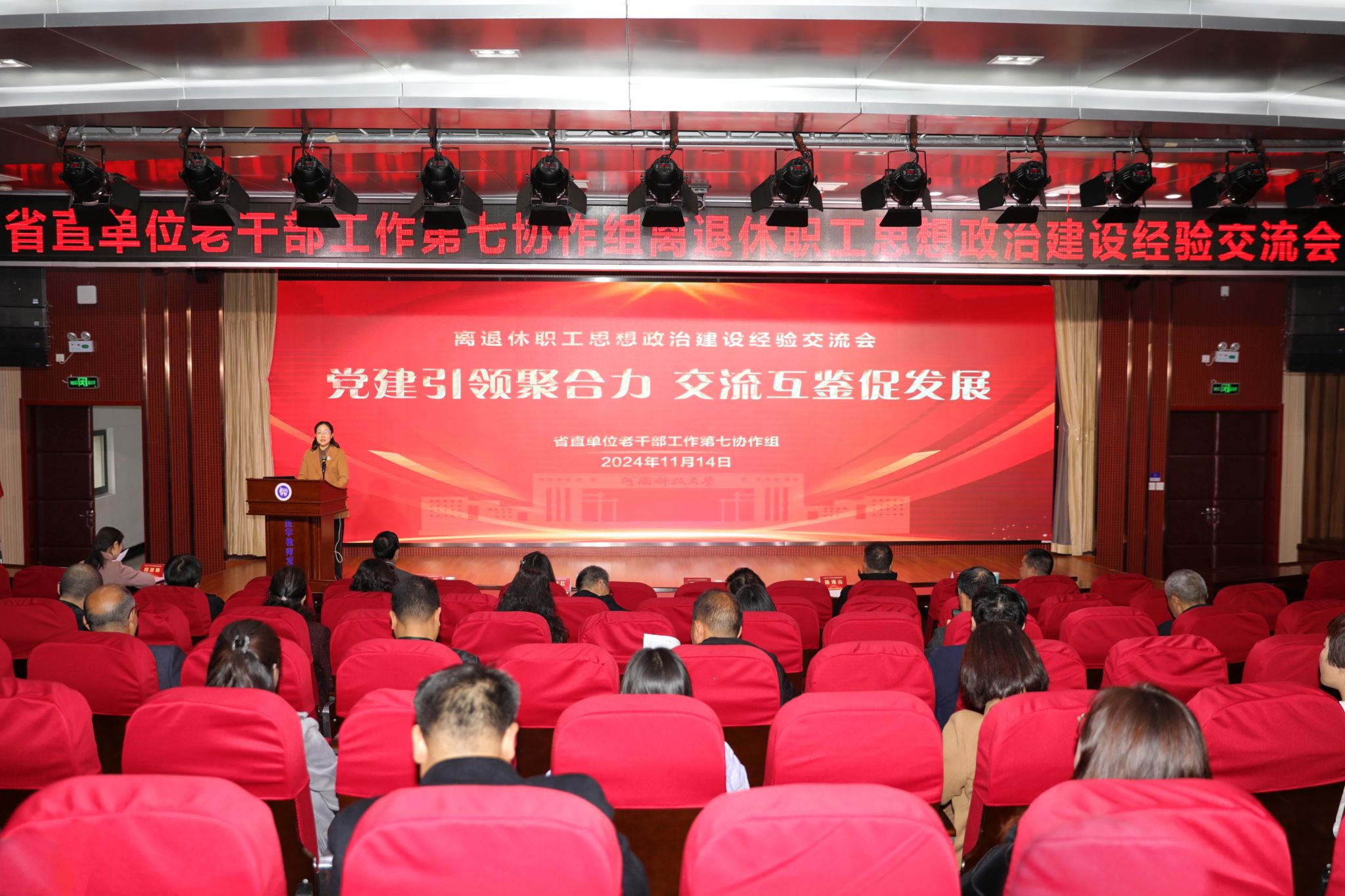 校新闻中心讯 11月14日,省直单位老干部工作第七协作组离退休职工思想政治建设经验交流会在我校召开。党委副书记、工会主席杨霞,第七协作组成员单位20所省属公办本科高校离退休职工管理部门负责人参加会议。