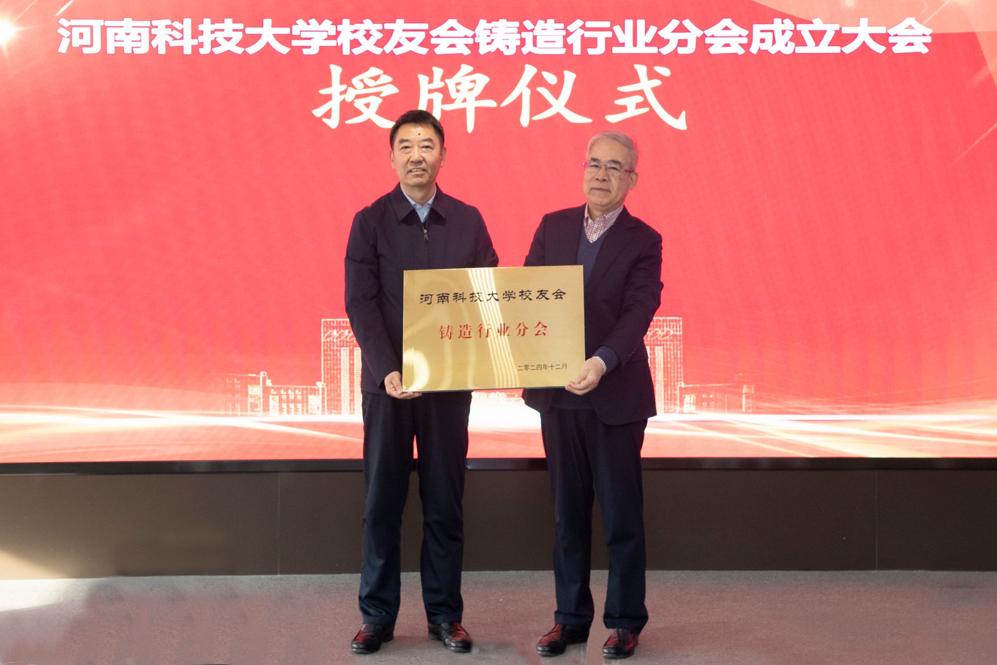 王洪彬为正规博彩平台校友会铸造行业分会授牌。