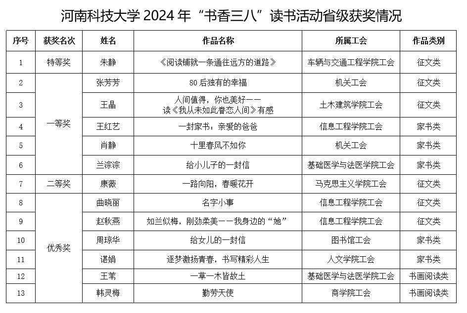 校新闻中心讯 近日,河南省教科文卫体工会下发《河南省教科文卫体工会委员会关于2024年“书香三八”读书活动获奖情况的通报》(豫教科文卫体工〔2024〕47号),我校在该项活动中喜获佳绩,共有13件作品获奖,其中车辆与交通工程学院朱静老师的作品《阅读铺就一条通往远方的道路》荣获征文类特等奖,另有一等奖5项、二等奖1项,优秀奖6项。