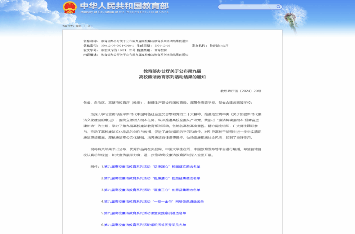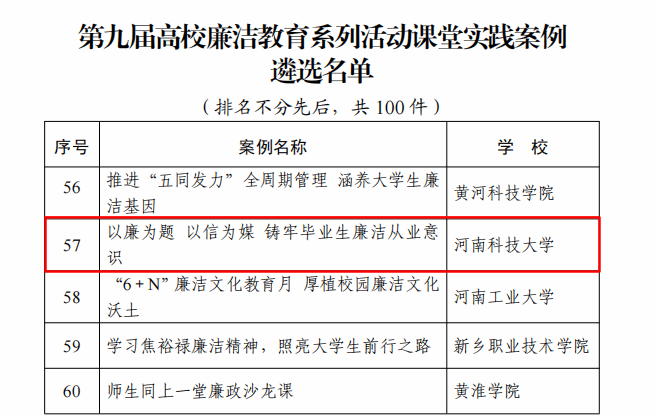 校新闻中心讯 近日,教育部办公厅印发《关于公布第九届高校廉洁教育系列活动结果的通知》(教思政厅函〔2024〕20号),我校《以廉为题 以信为媒 铸牢毕业生廉洁从业意识》入选全国100例课堂实践案例遴选名单,全省共5项入选。这是继去年我校《“廉政课堂”助推清廉学校建设》入选教育部廉洁系列活动案例展示优秀作品后再次入选。