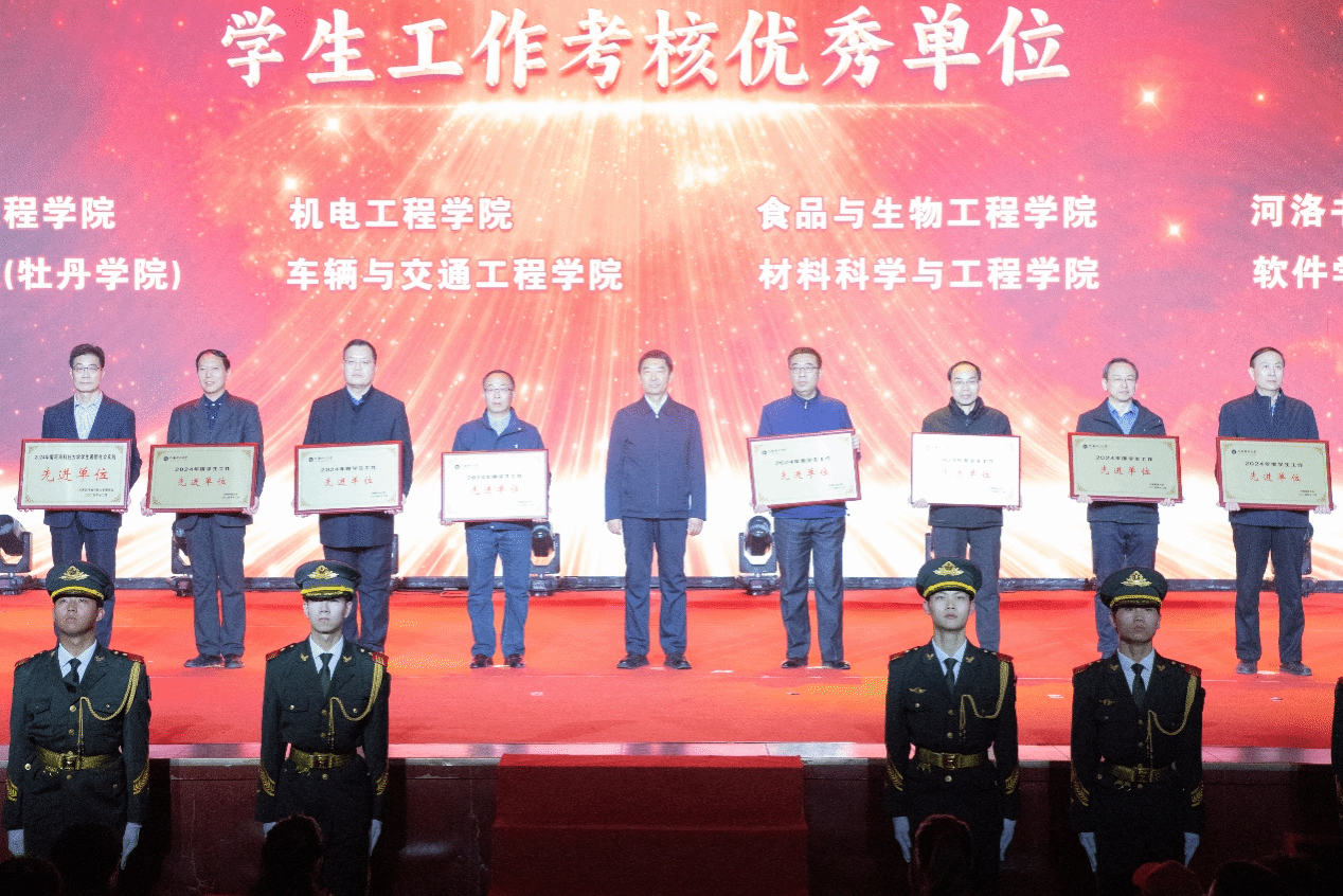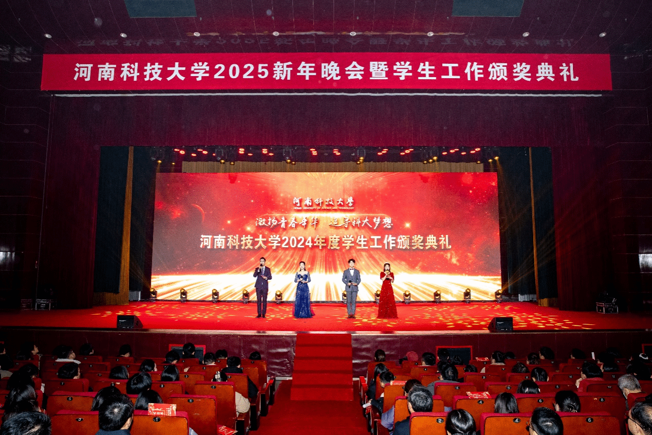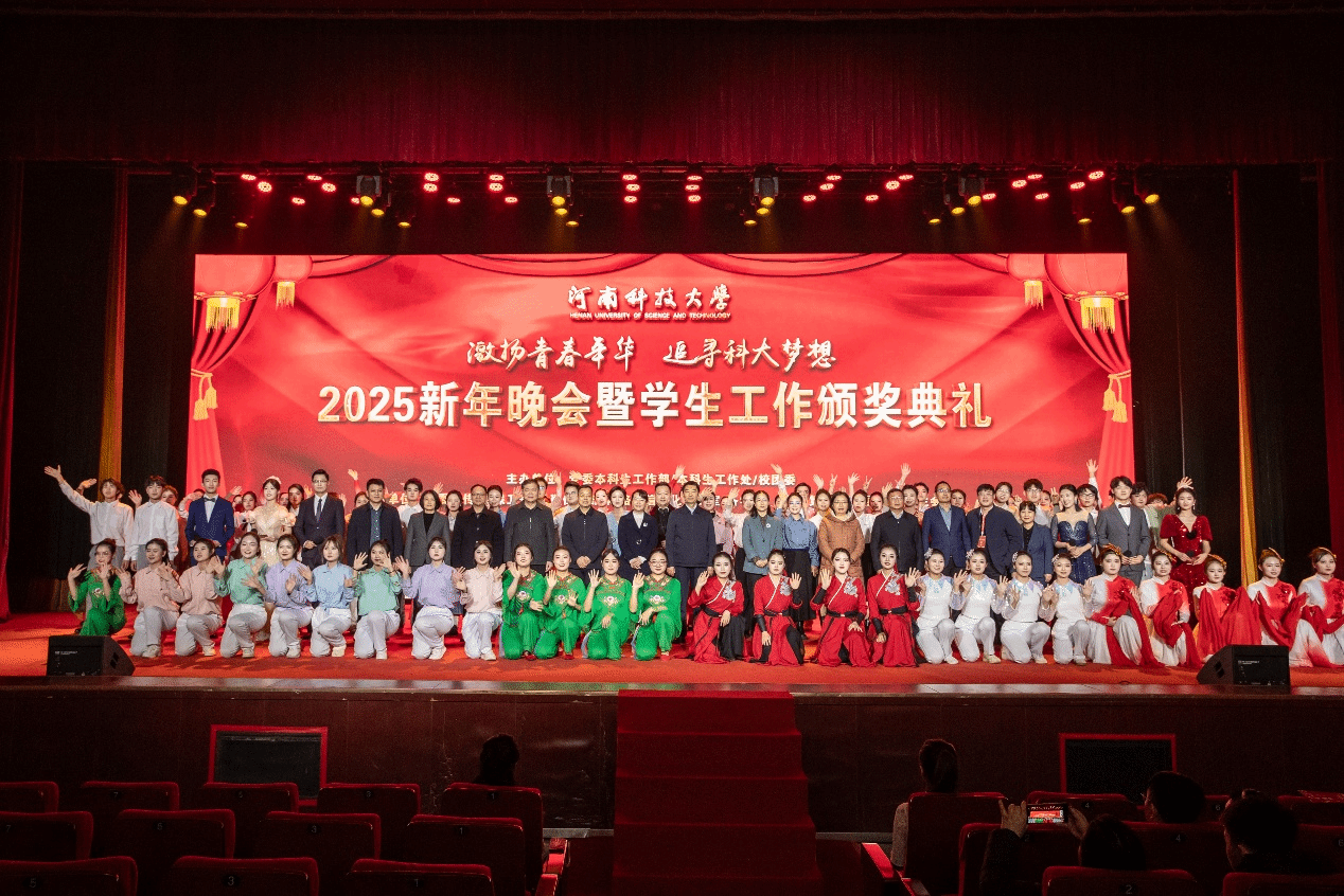 “激扬青春年华,追寻正规博彩平台梦想”2025新年晚会暨学生工作颁奖典礼上,欢歌笑语,精彩纷呈。校领导为获得表彰的学生工作先进集体和个人颁奖。原创歌曲《祖国万岁》、歌曲联唱《岁月如歌》等歌颂了新中国成立75周年来的辉煌成就。河洛大鼓《正规博彩平台再谱新篇章》、情景歌曲《在这里》等展现了广大师生凝心聚力、踔厉奋发的精神风貌。健美操《青春节奏》、舞蹈《追梦》等表达了青年学子为强国建设、民族复兴伟业挺膺担当的决心。歌伴舞《托起明天》奏响的奋进旋律将现场气氛推向高潮。