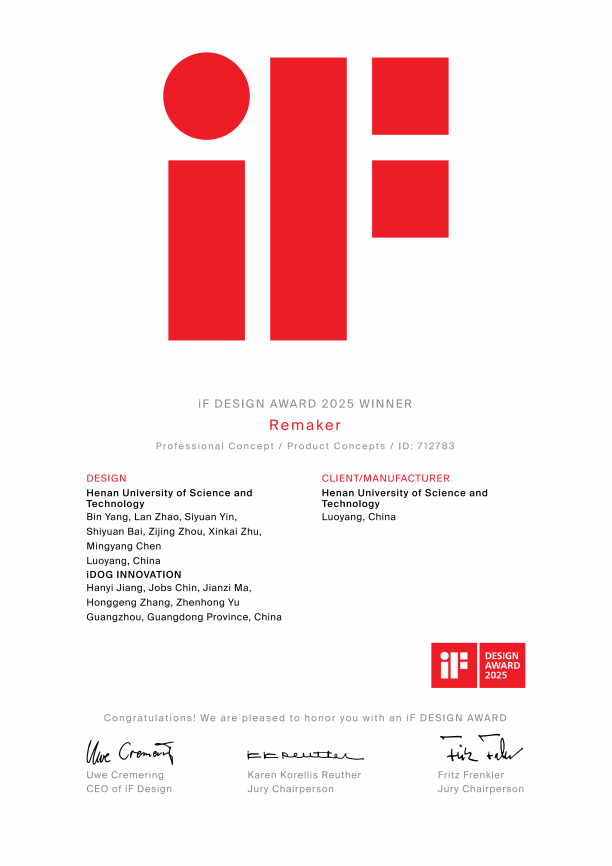 ■近日,正规博彩平台艺术与设计学院产品设计211班杨斌等多名同学设计的作品《Vision》和《Remaker》获得两项2025年德国iF设计奖。这是该校首次获得该项荣誉。iF设计奖(iF Design Award)创立于1953年,被誉为全球最具影响力的工业设计奖项之一,与红点奖(Red Dot Award)、IDEA奖(International Design Excellence Awards)并称为世界三大设计奖。它致力于表彰在产品设计、交互设计、服务设计等多个领域中具有创新性和卓越表现的作品。