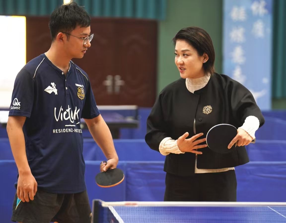 训练课结束后,刘伟兴致勃勃地拿起球拍,与师生切磋球技,场馆内不时爆发出爽朗的笑声。