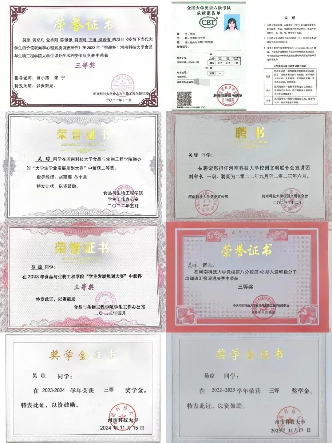 在综合素养提升上,两人也齐头并进。吴琼和闫芍都通过了英语等级考试,均取得普通话等级证书。在班级工作中,吴琼担任心理委员,凭借出色的组织和管理能力,成功组织班级成员开展各类丰富多彩的活动;闫芍担任班级文体委员,同样展现出较强的组织和管理能力。他们都热爱体育运动,闫芍曾在校体育活动中多次荣获奖项,吴琼在闫芍的带领下也坚持了每天运动。