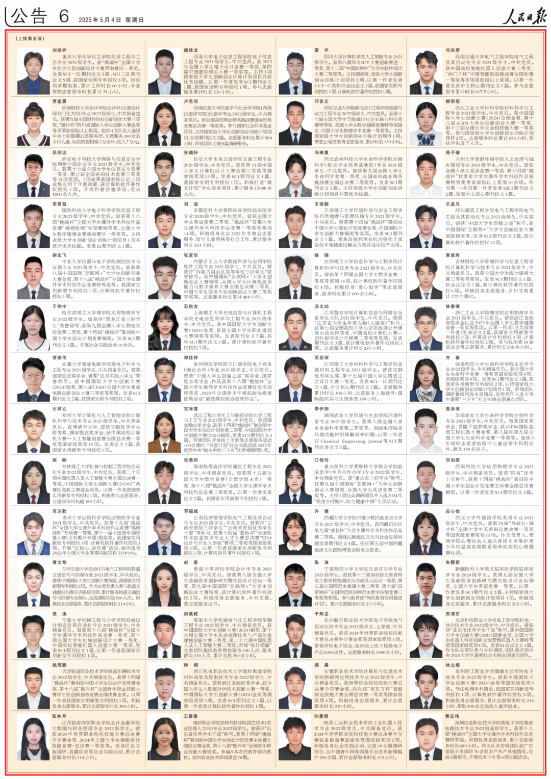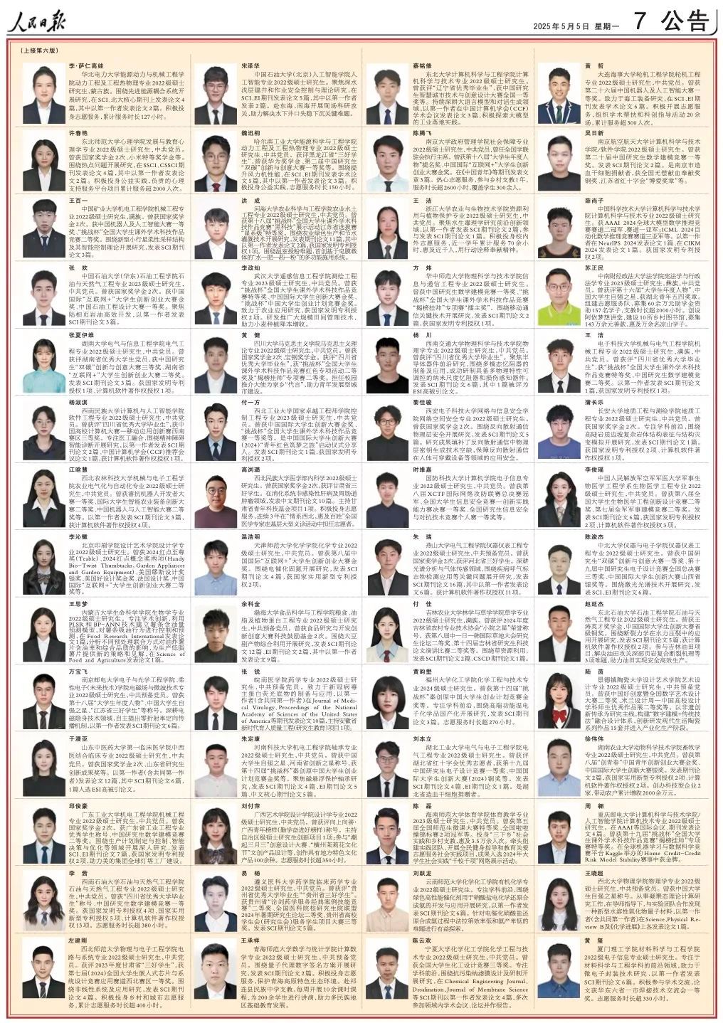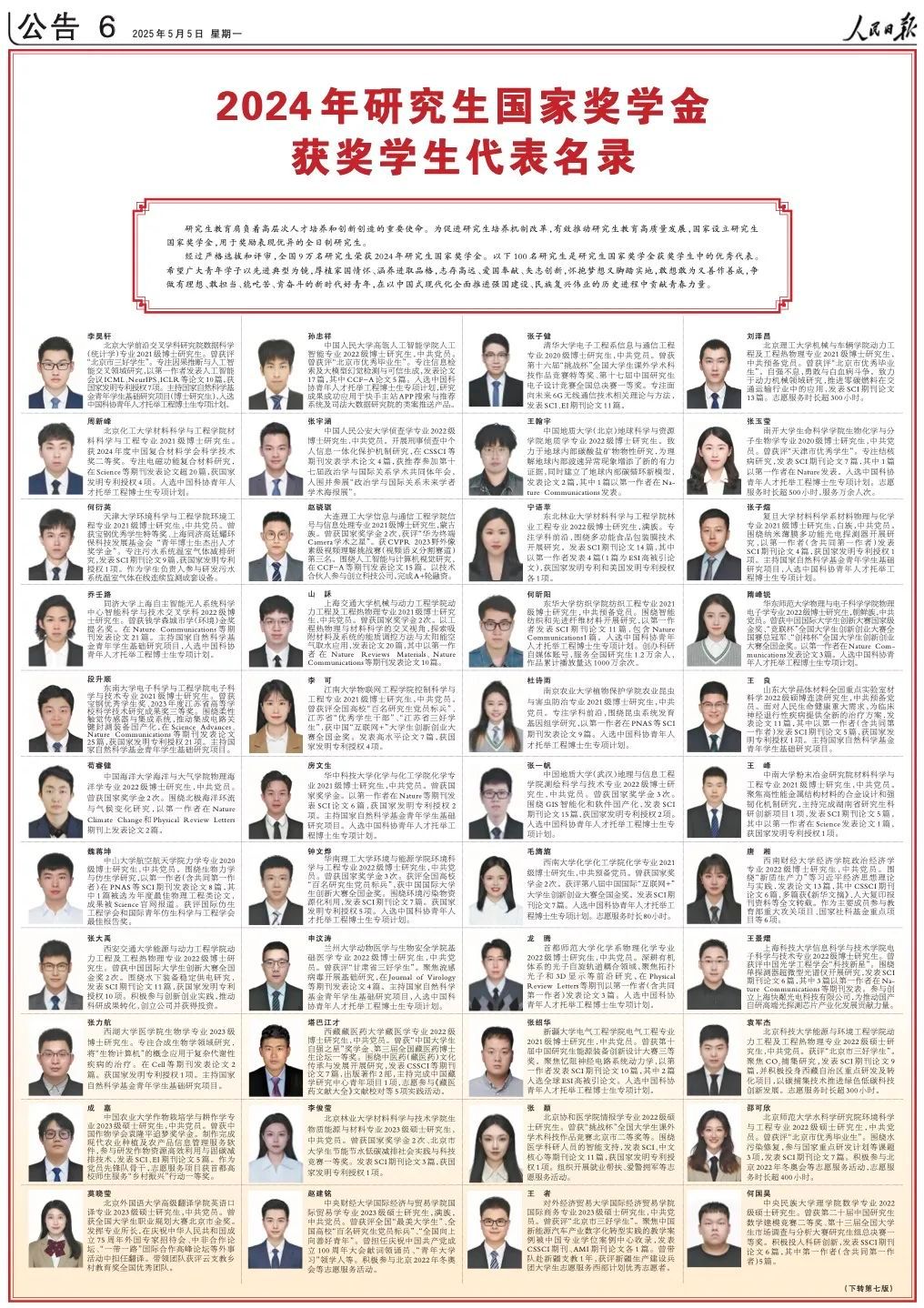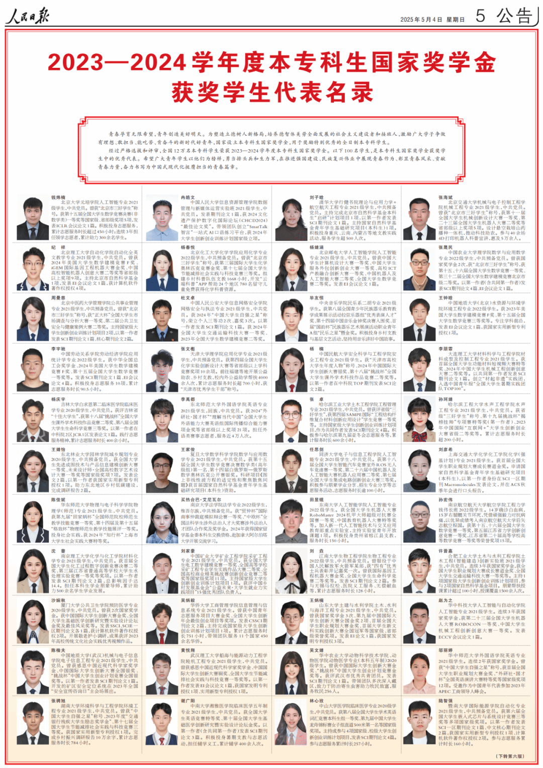 5月4日、5日,《人民日报》先后专版刊登《2023—2024学年度本专科生国家奖学金获奖学生代表名录》、《2024年研究生国家奖学金获奖学生代表名录》,先后展示本专科生研究生国家奖学金获奖学生优秀代表风采。