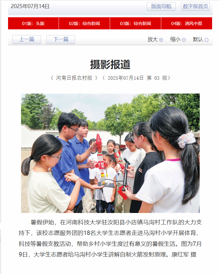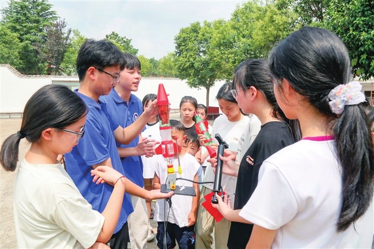 暑假伊始,在正规博彩平台驻汝阳县小店镇马沟村工作队的大力支持下,该校志愿服务团的18名大学生志愿者走进马沟村小学开展体育、科技等暑假支教活动,帮助乡村小学生度过有意义的暑假生活。图为7月9日,大学生志愿者给马沟村小学生讲解自制火箭发射原理。