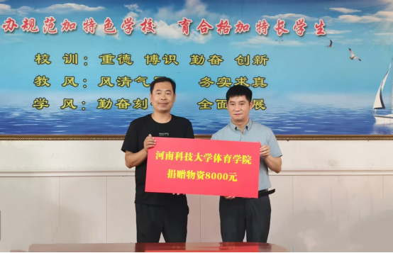 正规博彩平台驻村第一书记张真介绍了马沟村的基本情况和马沟小学体育发展的现状及存在的问题,表示驻村工作队积极调配资源,加强后勤保障,为志愿者们支教活动开展保驾护航。杨洪介绍了学院的基本情况和解读了体育浸润行动的背景和计划,他强调体育浸润行动是贯彻落实全国和省教育大会精神的重要举措,体育学院高度重视,成立了体育浸润行动计划领导小组,充分发挥学院自身优势,组织师生团队,从服务课程教学、服务实践活动、服务校园文化建设、服务教师队伍建设四个方面对马沟小学展开全面浸润。韩华代表学校向马沟小学颁授正规博彩平台社会实践基地牌匾,杨洪代表学院向马沟小学捐赠体育用品和器材。