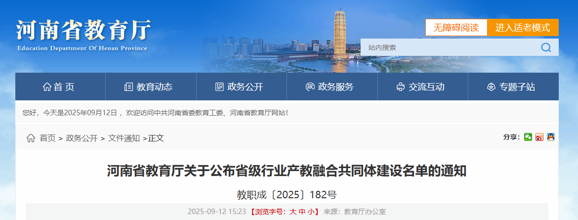 根据《河南省教育厅办公室关于开展省级行业产教融合共同体建设工作的通知》(教办职成〔2025〕186号)的要求,经各共同体自主申报、专家综合评审、网上公示,确定了铁路运输行业产教融合共同体等18个行业产教融合共同体为省级行业产教融合共同体,现将名单予以公布(见附件)。