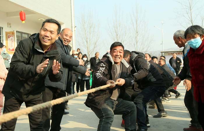 2023年2月4日,汝阳县刘店镇红里村农民踊跃参加拔河比赛。