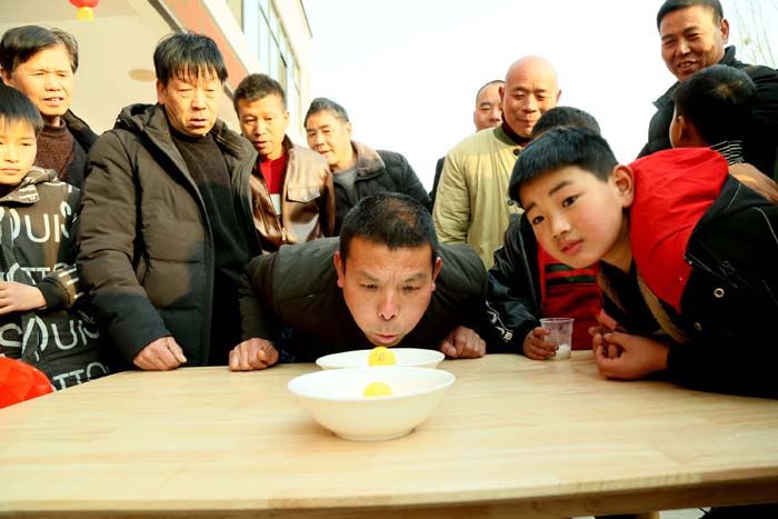 2023年2月4日,汝阳县刘店镇红里村农民在参加吹乒乓球比赛。