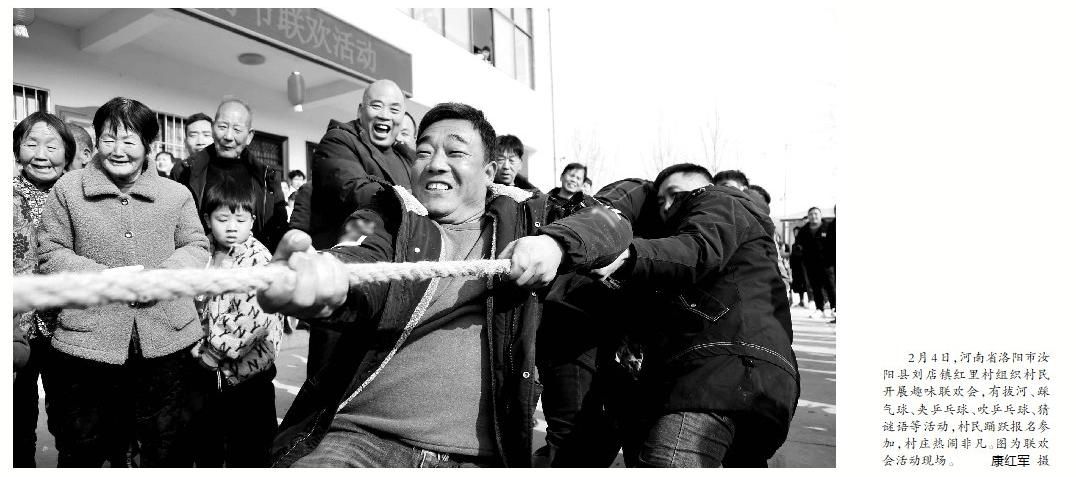 2月4日,河南省洛阳市汝 阳县刘店镇红里村组织村民 开展趣味联欢会,有拔河、踩 气球、夹乒乓球、吹乒乓球、猜 谜语等活动,村民踊跃报名参 加,村庄热闹非凡。图为联欢 会活动现场。 康红军 摄