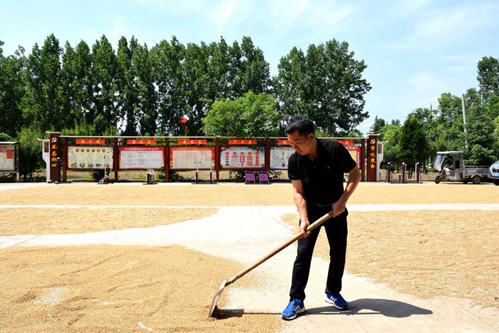 “三夏”期间,汝阳县刘店镇红里村驻村第一书记甘从辉在帮助农民晾晒小麦。