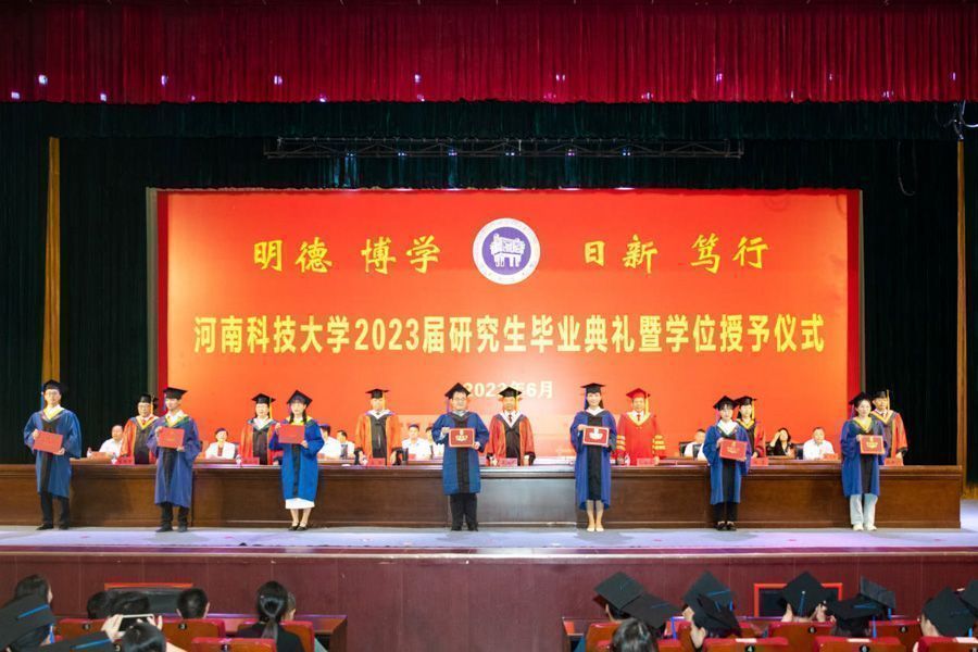在欢快的乐曲声中,校领导为2023届优秀毕业研究生代表颁发荣誉证书,为获得博士学位和硕士学位的研究生正冠拨苏,授予学位,并与他们合影留念。