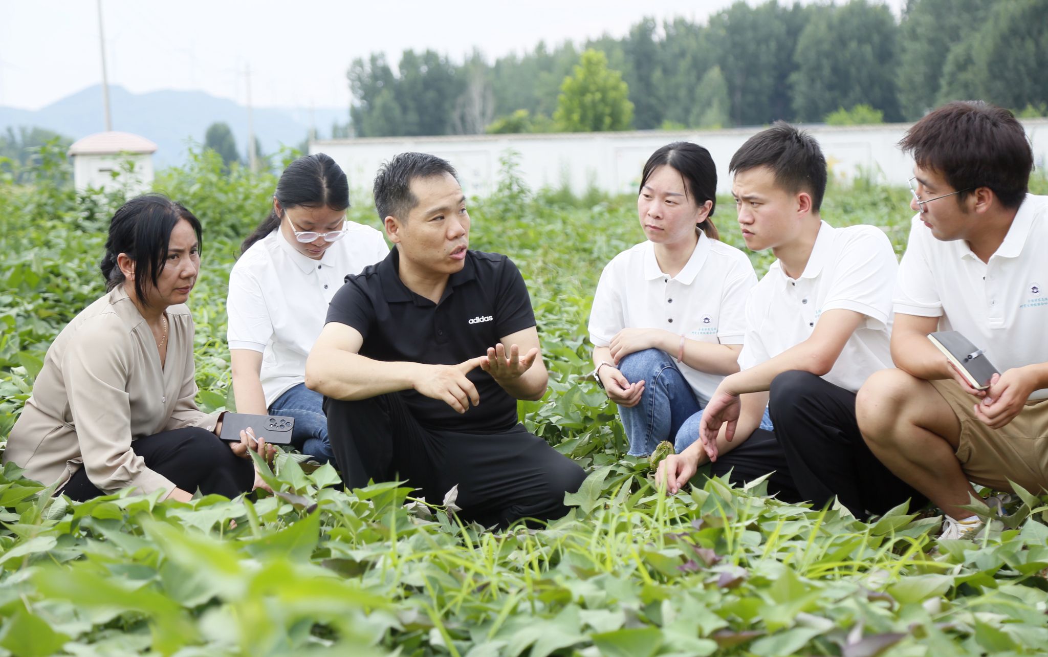 7月24日,在汝阳县红里村红薯试验田,该村驻村第一书记甘从辉(左三)向博士生介绍种植红薯情况