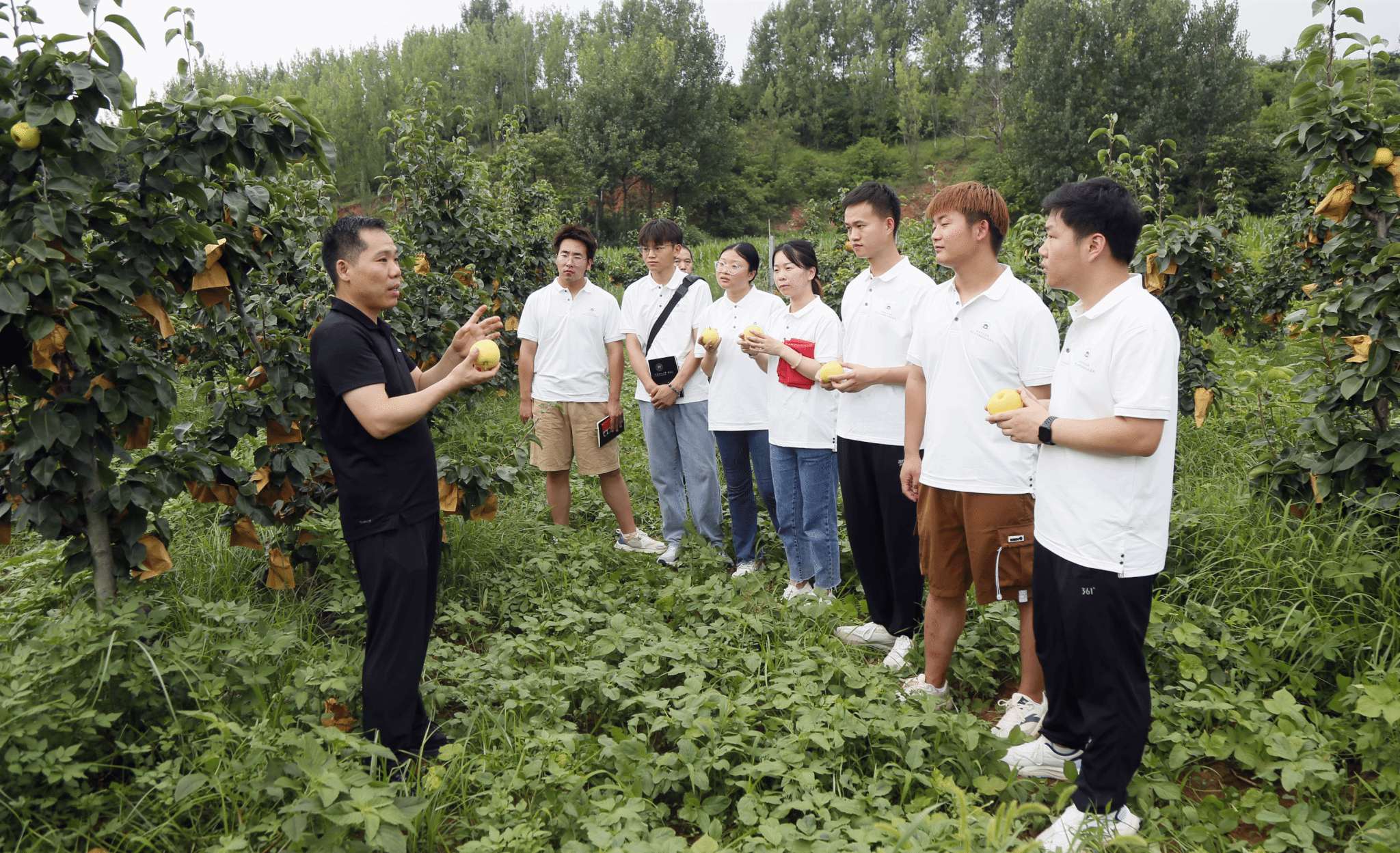 7月24日,在河南省洛阳市汝阳县红里村润耕家庭农场,驻村第一书记向博士生介绍农户发展特色产业金果梨种植情况