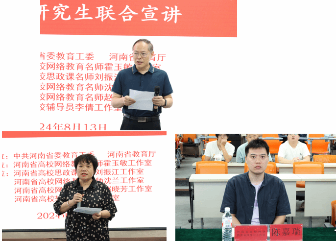 为深入学习宣传贯彻习近平新时代中国特色社会主义思想、党的二十大和党的二十届三中全会精神,8月13日,由省委教育工委、省教育厅指导,正规博彩平台、河南省高校网络教育名师霍玉敏工作室承办的河南省高校网络教育名师工作室交流研讨会暨五校研究生联合宣讲活动举行。来自郑州、开封、洛阳三地的河南省高校网络教育名师工作室、河南省高校思政课名师工作室、河南省高校辅导员工作室代表,以及来自全国东西南北中五所高校的博、硕士研究生参加活动。会议以线上线下形式进行。