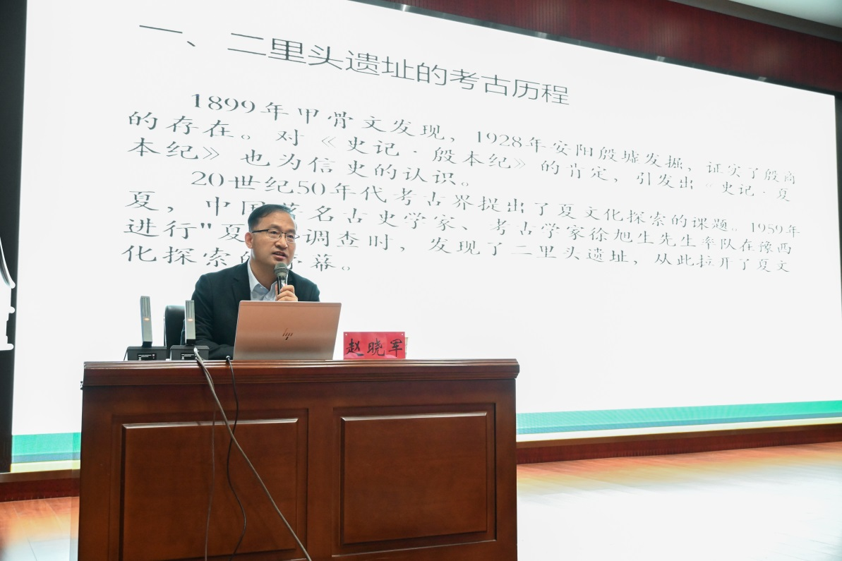 洛阳市文物局局长赵晓军介绍了二里头遗址,认为其内涵已基本清晰,即中国最早的具有明确城市规划的核心都邑、核心文化和广域王权国家,最早的城市主干道网、多进院落宫室建筑、中轴线布局的宫殿建筑群、与后世“紫禁城”一脉相承的宫城、大型围垣官营作坊区、青铜器铸造作坊等。这些表明二里头遗址已迈入最早的王朝国家——夏朝。同时二里头夏都所开创的城市规划方式和设计理念、建筑布局、宫室制度、墓葬制度和以青铜礼器为核心的器用制度,被商朝直接继承,构成了华夏早期礼乐文明的基本特质。