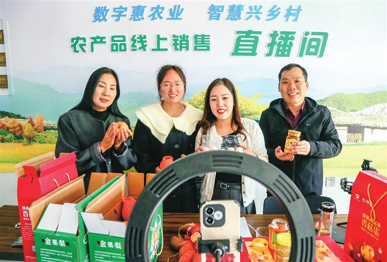 10月22日,汝阳县刘店镇红里村驻村第一书记甘从辉(右一)和村党支部书记赵会营(左一)及村直播间工作人员在直播售货。近年来,刘店镇通过党建引领,实施“党支部+合作社+农户”的经营方式,通过电商平台,扩大农产品销售渠道。红里村在甘从辉的带动下,通过直播间,把村里的红薯、香菇、蜂蜜、鸡蛋在线上销售,促进农民增收致富。