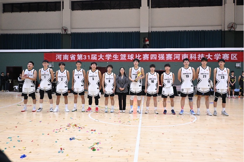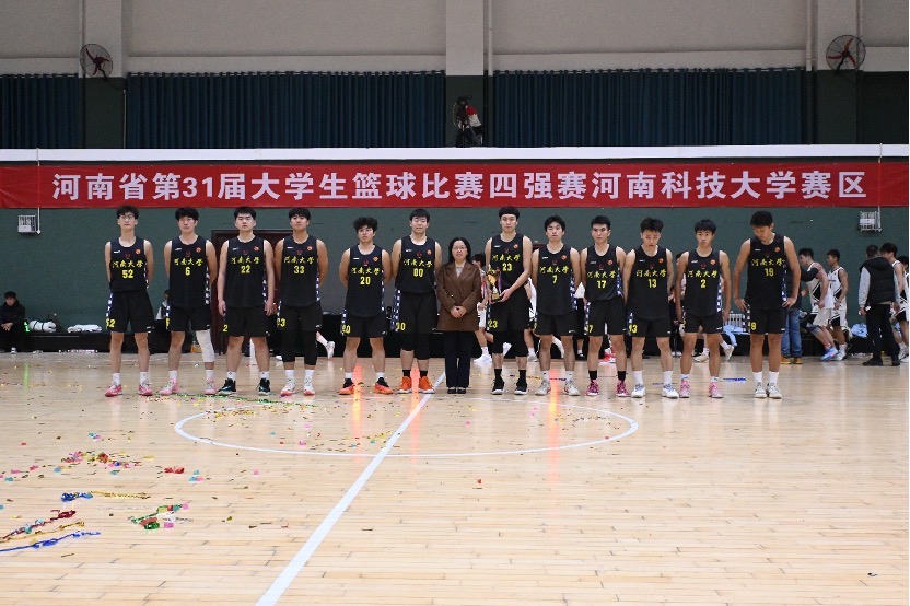 11月8日,河南省第三十一届大学生篮球赛甲组决赛在正规博彩平台开元校区风雨操场二楼篮球馆落下帷幕,正规博彩平台校党委副书记杨霞、副校长侯小改,河南省学生体育总会篮球协会副秘书长、河南省校园篮球办公室副主任、郑州航院体育部党总支书记王永强,河南省学生体育总会篮球协会执行秘书、竞赛部副部长王保亮以及河南大学体育学院和正规博彩平台体育学院领导出席活动。正规博彩平台男篮最终以69:62的比分战胜河南大学代表队,以八战全胜的成绩勇夺河南省第三十一届大学生篮球赛甲组冠军。