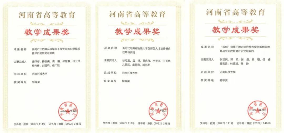 坚持质量立校,全面规范质量标准,已形成“三督、三查、两评、两报”的“3322”校内质量监测体系和评估体系,每年高质量完成教学基本状态数据分析报告和本科教学质量报告编制,全面了解学校教学基本状况。不断强化“评估+认证+评价”的“三维一体”外部周期性评价,持续完善“立体式双闭环”质量保障体系,注重质量持续改进,经过达成度、适应度、保障度、有效度、满意度等“五个度”检验和持续改进,培养德智体美劳全面发展的应用研究型高级专门人才。依托“一个体系”,实施“六大工程”,实现“四个转变”,推进质量文化建设,着力提升本科教育教学的质量保障能力。2021年,“地方高校以学生为中心的教育质量文化建设研究与实践”获河南省教学成果一等奖。2024年,“‘双一流’创建背景下地方综合性大学教学质量智能监控模式构建与实践”获河南省教学成果特等奖。