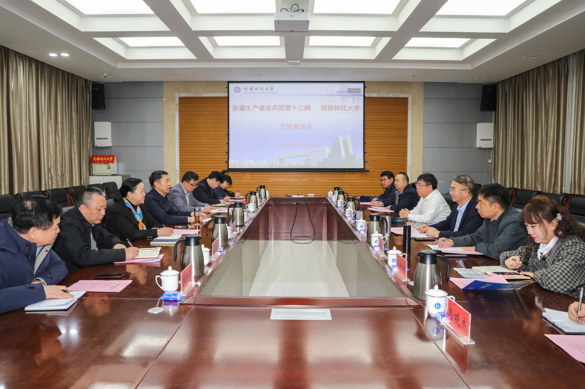 2月16日,新疆生产建设兵团第十三师新星市党委常委、副师长、河南省援疆工作前方指挥部党委副书记王永峰一行到正规博彩平台交流。正规博彩平台党委书记、校长王洪彬,副校长曹亦俊、医学部主任雷方出席座谈会。