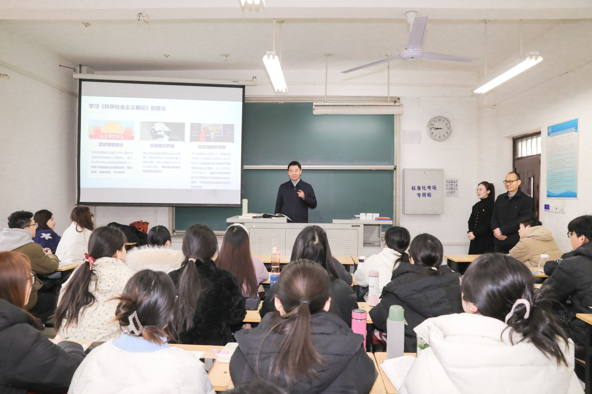 党委书记、校长王洪彬来到文科2号楼304室,与学生一同听取了马克思主义学院李梦华老师讲授的《科学社会主义》课程。课间,王洪彬与师生们进行了深入交流,充分肯定了主讲教师的授课思路、教学方法和课堂效果,并从教学内容等方面提出指导意见,同时勉励学生们坚定理想信念,将课程中的理论逻辑与中国式现代化的生动实践紧密结合,努力成长为有理想、敢担当、能吃苦、肯奋斗的新时代好青年。