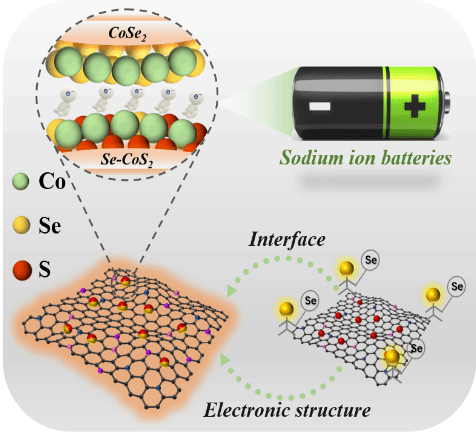 CoS2作为典型的转化型储钠阳极,具有高理论容量、独特的四电子反应机制、多重价态和结构多样性等优势。但其低的本征电导率(1.63×10−5 S cm−1)易导致储钠过程中离子/电子传输动力学过程缓慢,倍率性能不足,储钠优势被弱化。该论文报道了一种逐级Se化实现界面与电子结构双向调控的策略,显著提升了CoS2本征电导率,同时构建的同源钴基异质结进一步增强了材料的界面效应和储钠活性。实验结合理论计算结果证实这种特殊异质结构Se-CoS2/CoSe2的形成过程为:一步硫硒化过程中优先形成CoS2组分。随后,Se逐步取代CoS2中的S位点,富Se区以完全取代产物CoSe2为主,缺Se区以不完全取代Se-CoS2为主。得益于这种基于Se-CoS2的电子结构调控和CoS2/CoSe2异质结间的界面调控,优选的复合材料表现出突出的倍率性能和高的储钠容量。该研究为提升低电导率活性材料和新型异质结构的设计提供了思路。