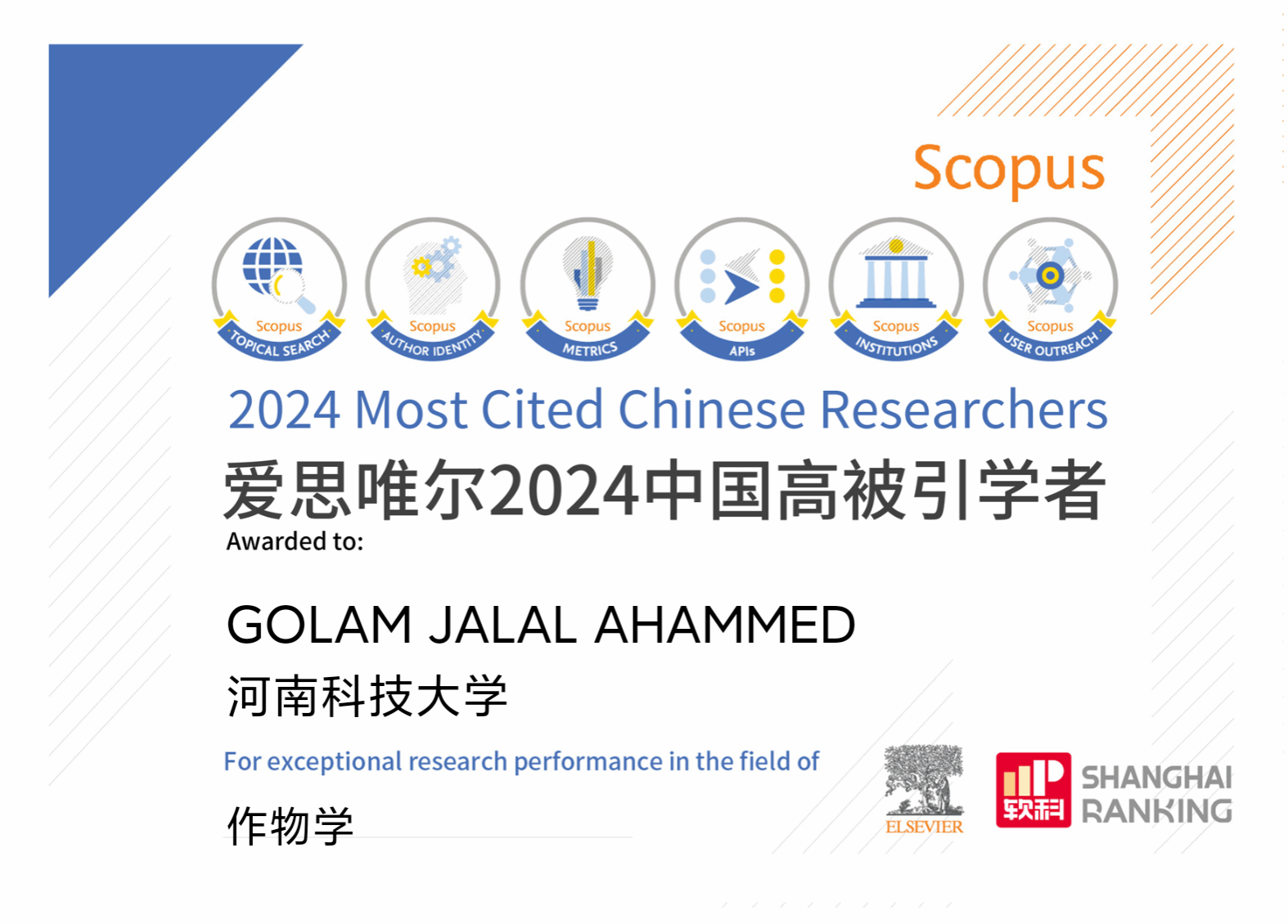 校新闻中心讯 3月25日,爱思唯尔(Elsevier)发布2024“中国高被引学者”(Highly Cited Chinese Researchers)榜单,我校园艺与植物保护学院河南省特聘教授Golam Jalal Ahammed入选“作物学”学科榜单。