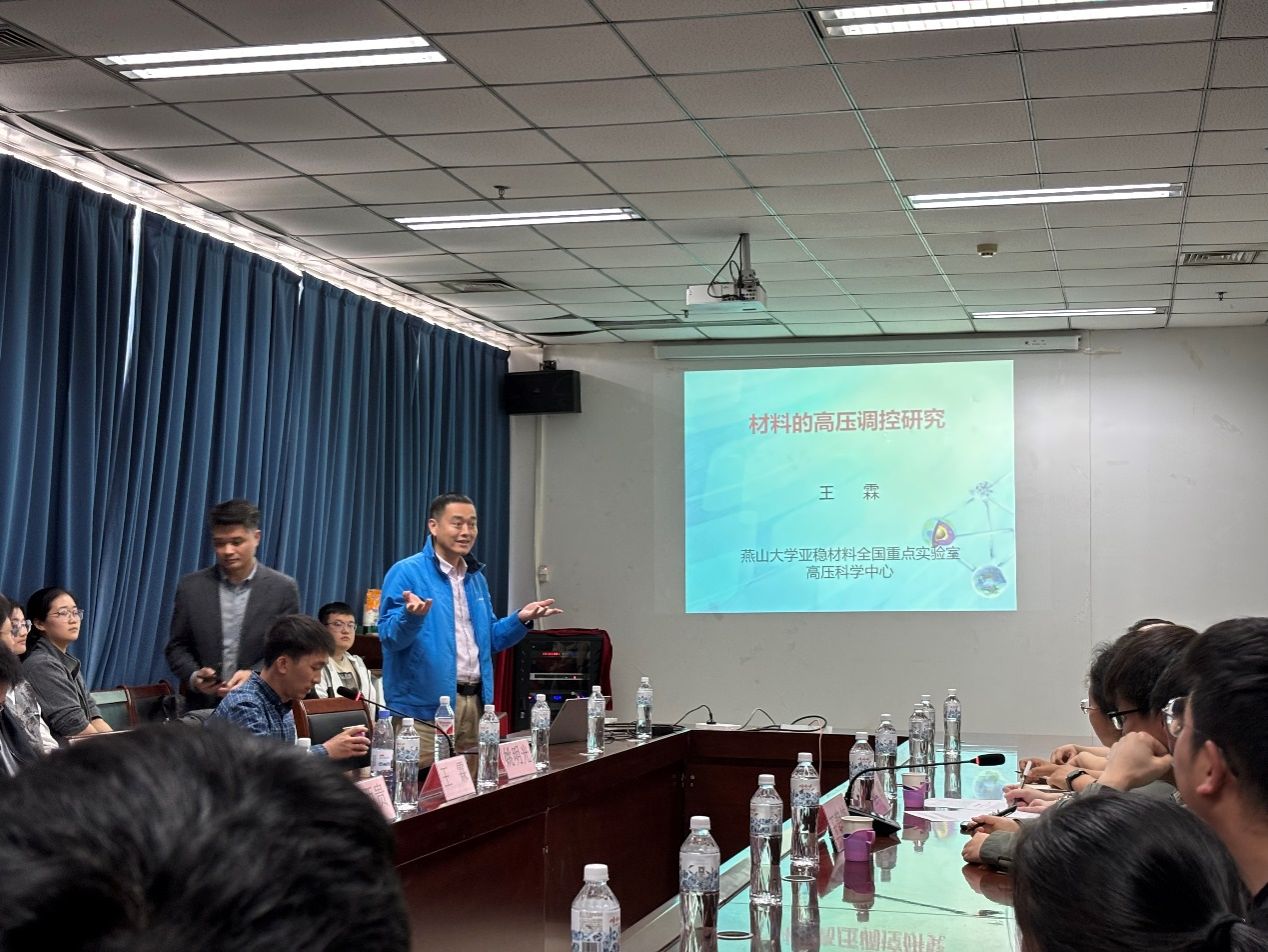 王霖教授从高压讲起,介绍了在压力作用下,凝聚态物质不仅体积会被压缩,其晶体结构、分子结构、电子结构、元素价态乃至电子自旋态,都会发生一系列转变,并且伴随着各种新奇物理现象的出现。同时报告了其课题组近年来在二维过渡金属卤化物灯的晶体结构、光学形质、电学输运和磁性等高压研究成果。报告会后,王教授与在座师生进行了深入交流。