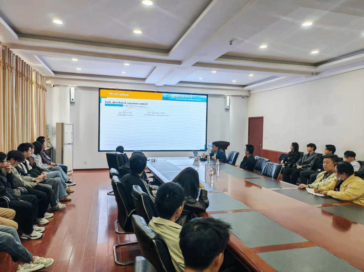 向教授在报告中提出了一种面向一类无领导者多智能体系统的最优一致性协议,设计过程中无需任何全局信息(包括拉普拉斯矩阵的特征值),通过为每个智能体设计参考轨迹,构建了反映轨迹偏差演化与控制代价的综合性能函数,并在控制方案实施中,采用了神经网络逼近工具,并通过数值仿真系统验证了方案的有效性。报告结束后,向教授与参会师生们进行了热烈交流与讨论。
