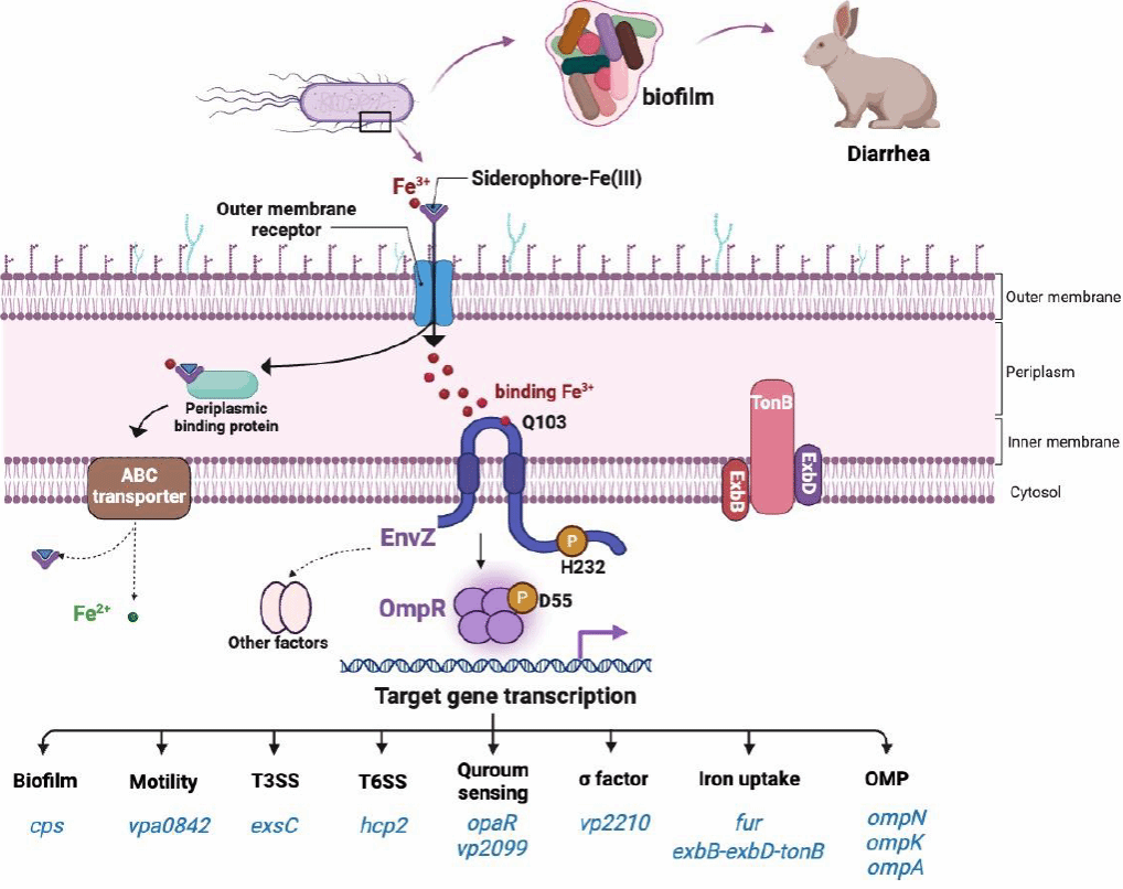 研究揭示,副溶血弧菌双组分系统EnvZ可作为直接的Fe3+传感器,控制细菌毒力程序。Fe3+与EnvZ的相互作用触发了激酶的磷酸化,激活OmpR实现生物膜形成、群集运动以及III/VI型分泌系统的转录调控。EnvZ突变体(EnvZQ103A)消除了Fe3+的反应性和下游信号通路,为抗感染新药研发锁定关键靶点。在幼兔感染模型中,Fe3+通过EnvZ/OmpR信号传导系统增强副溶血弧菌的肠道定植能力和毒力。该研究首次报道了EnvZ从经典的渗透压传感器“进化”为铁离子探测器的分子机制,凸显了病原菌信号通路的高度可塑性。针对这一新发现开发铁感知抑制剂,有望为应对日益严峻的耐药菌感染问题提供创新解决方案。