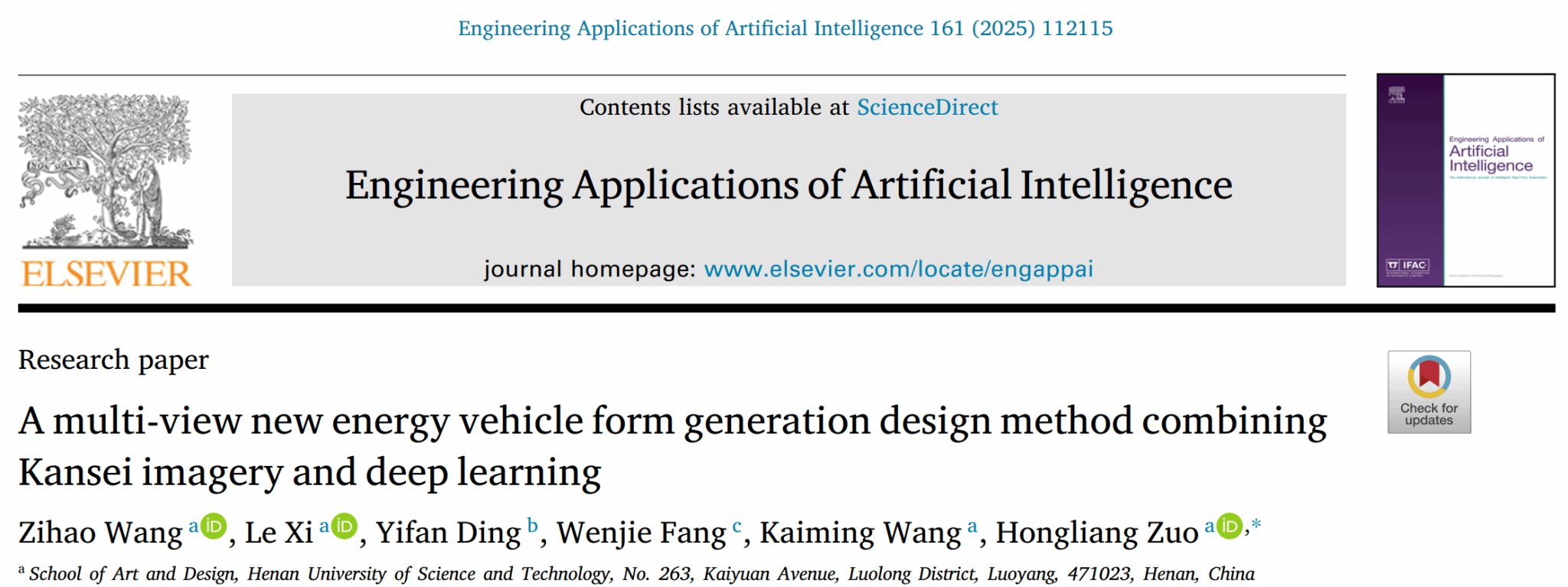 校新闻中心讯 近日,我校艺术与设计学院左洪亮副教授团队在国际顶级人工智能学术期刊Engineering Applications of Artificial Intelligence发表题为“A Multi-view New Energy Vehicle Form Generation Design Method Combining Kansei Imagery and Deep Learning”的研究文章。研究提出了一种将感性工学与深度学习相结合的多视角映射方法,为新能源汽车外观设计提供了一个可扩展的智能化设计框架。该论文一作为工业设计工程25届硕士生王子豪,二作为艺术与设计学院席乐副教授。