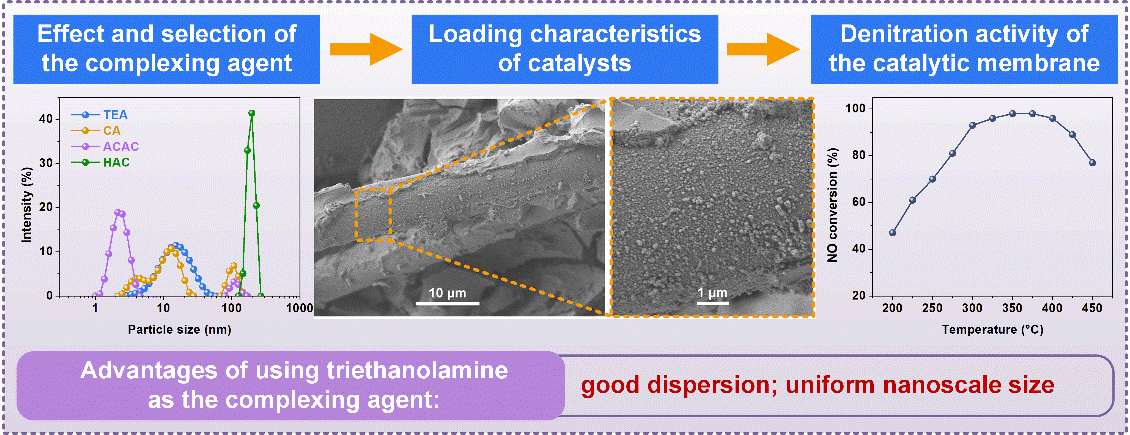 以陶瓷纤维催化滤芯为核心的高温除尘脱硝一体化技术是目前工业烟气净化从“单一污染物控制”迈向“多污染物协同控制”的重要发展方向。为了改善催化滤芯中催化剂的负载特性,该研究在合成过程中引入了不同络合剂进行调控。研究明确了各络合剂相应的络合结构及其对溶胶性质的作用机理,深刻阐明了催化剂的构效机制,所优选制备的催化滤芯获得了分散性好、粒度均匀的纳米催化剂负载结构,并展现出优异的应用性能和稳定性。该研究成果可为高性能催化滤芯的构筑提供关键技术支撑。