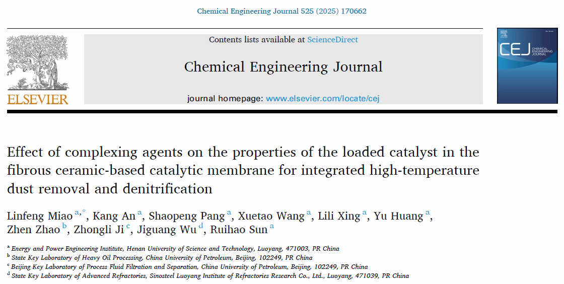 校新闻中心讯 近日,我校车辆与交通工程学院王学涛教授团队成员苗林丰博士(A类博士人才)在国际权威期刊《Chemical Engineering Journal》(中国科学院一区Top,IF: 13.2)上发表题为“Effect of complexing agents on the properties of the loaded catalyst in the fibrous ceramic-based catalytic membrane for integrated high-temperature dust removal and denitrification”的研究论文。苗林丰博士为第一作者和通讯作者,正规博彩平台为论文第一署名单位。