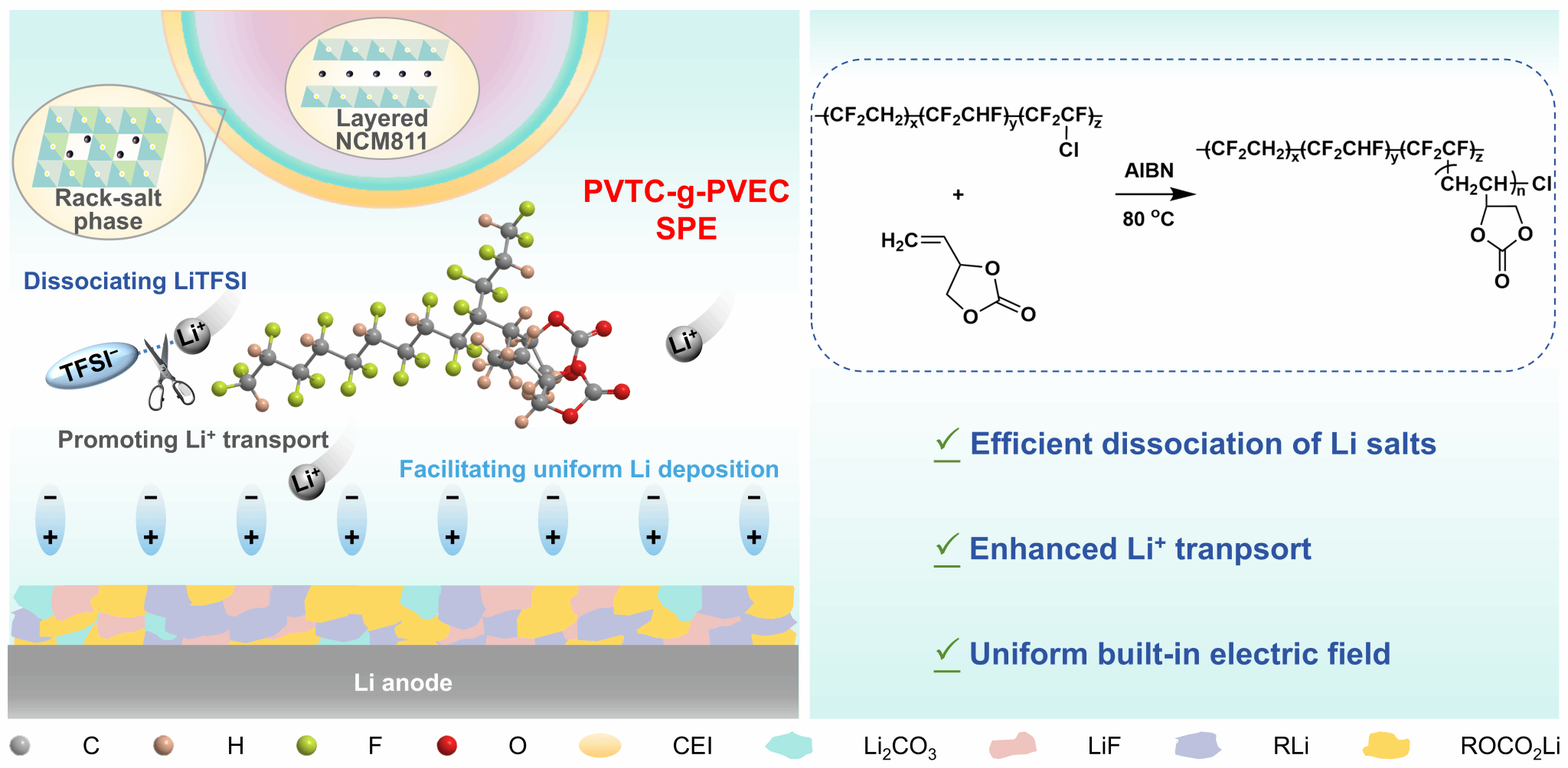 针对聚碳酸酯基固态聚合物电解质室温离子电导率低、锂枝晶生长严重等关键瓶颈问题,本研究创新地提出原位聚合铁电工程策略,通过铁电聚合物PVTC与VEC单体的原位接枝共聚,成功制备出PVTC-g-PVEC新型固态电解质。该电解质凭借极性官能团的协同作用,有效促进锂盐解离与锂离子输运,其铁电特性可构建内建电场,有助于锂离子均匀沉积并抑制锂枝晶生长,同时形成稳定的电极/电解质界面。基于该电解质的锂对称电池实现超10000小时(>416天)稳定循环,LiFePO4全电池在2C倍率下循环1000次仍有78.48%的容量保持率,此外,高电压NCM811全电池及软包电池均展现优异的电化学性能与安全可靠性。本研究提出的原位聚合铁电工程策略为高性能固态锂金属电池的设计与开发提供了新的思路。