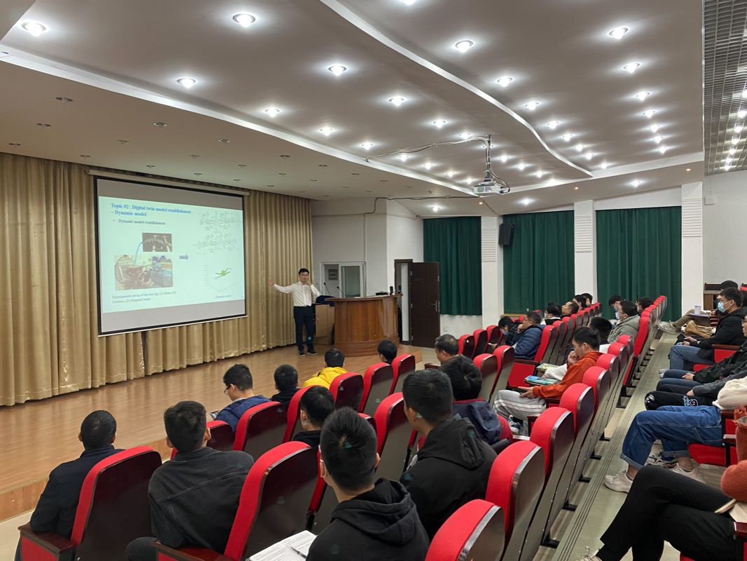 近年来,数字孪生技术(DT)因其独特的优势已引起了工业界与学术界的广泛关注。冯珂博士介绍了其在研究工作中提出了一种系统化且实用的数字孪生技术,该技术包括:基于实测数据的数字孪生模型搭建、孪生模型与实际物理测量的实时交互以及齿轮磨损进展下的齿轮箱剩余寿命(RUL)预测。报告会后,冯珂博士就数字孪生等热点问题与在座师生进行了交流。