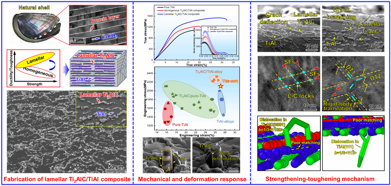 TiAl合金是使用温度600℃以上理想的轻质高温结构材料,在“克克计较”的航空发动机领域展现出令人瞩目的应用前景,但室温塑性差限制了其更广泛应用。启迪于自然界中贝壳等高强韧材料的巧妙叠层结构,该团队提出了“在TiAl合金中原位自生柔性陶瓷Ti2AlC并通过仿生层状构型设计全面提升TiAl合金性能”的科学思路。通过对原位合成机理、构型演变规律与性能耦合响应机制等关键科学问题的系统研究,设计制备出了强度-塑性均衡匹配的Ti2AlC/TiAl仿生层状复合材料。相关研究成果以“Balancing the strength and ductility of Ti2AlC/TiAl composite with a bioinspired micro-nano laminated architecture”为题在Materials & Design (2022, 220,110851)上发表。