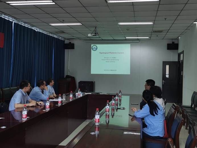 刘正猷教授首先介绍了声子晶体的基本概念,进一步拓展到能谷声子晶体和外尔声子晶体两类拓扑声子晶体,并介绍了其研究团队在声子晶体拓扑物态研究方面的最新进展。报告会后,刘正猷教授就拓扑声子晶体等问题与在座老师和研究生进行了交流。
