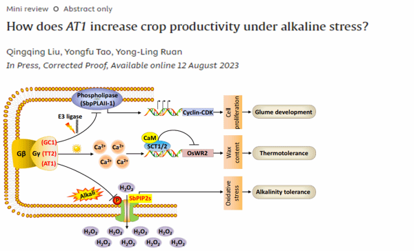 联合国粮农组织(FAO)统计显示全球有超过10亿公顷的盐碱地未能被有效利用,培育耐盐碱作物、提高盐碱地生产力是解决全球粮食安全问题和促进农业发展的重要途径。本文详细阐述了高粱中编码异源三聚体G蛋白γ亚基(Gγ)的AT1响应碱胁迫的负调控分子机制。AT1通过抑制PIP2s磷酸化削弱细胞内ROS外排赋予碱敏感,敲除后高粱获得耐碱性且在作物中保守;结合同样编码Gγ蛋白的GC1负调控高粱包壳性状分子机制和TT2调控水稻钙信号-蜡质代谢耐热性的信号通路,探讨了AT1可能涉及的例如其他靶标蛋白、Ca2+信号通路等潜在的耐碱分子机制、耐碱作物品种培育与利用过程中需综合考虑对其他农艺性状(如颖壳覆盖)影响等因素。该论文系统阐述和讨论了高粱中的AT1调控耐碱的分子机制及应用前景,为进一步利用耐盐碱基因、高效开发盐碱地等热点研究提供了思考。