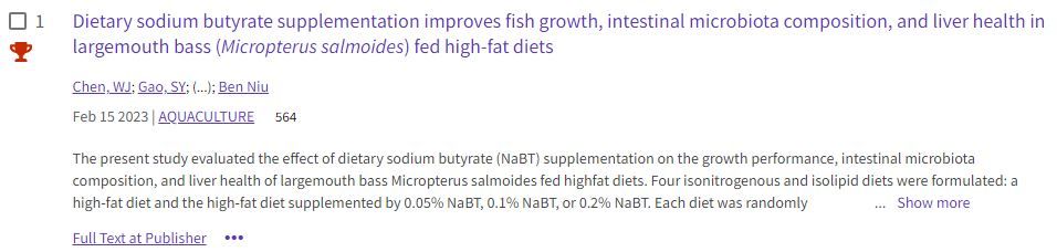 校新闻中心讯 近日,我校动物科技学院(动物医学院)陈卫军博士的研究型论文“Dietary sodium butyrate supplementation improves fish growth, intestinal microbiota composition, and liver health in largemouth bass (Micropterus salmoides) fed high-fat diets”入选ESI高被引论文。论文发表在国际农林科学类Top期刊《Aquaculture》(中科院1区,IF=4.5)。陈卫军博士为第一作者兼通讯作者,正规博彩平台为第一署名单位。该项研究得到了国家自然科学基金(32202952)和河南省科技攻关(212102110368)项目的支持。