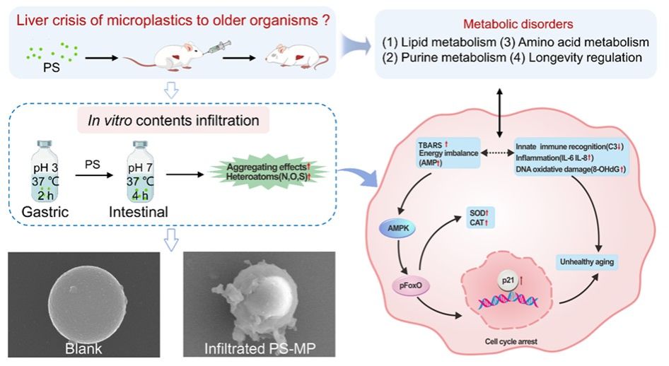 微塑料造成的毒性影响及其作用机制受到国际社会的广泛关注。孙平教授团队通过建立老龄动物模型,开展微塑料肝毒性研究。该研究首次证实胃肠道的消化作用可能对微塑料的理化性质产生显著影响,导致微塑料形成冠状结构,增强其团聚性,并引入杂原子。同时,微塑料引起的肝细胞膜损伤和免疫系统的异常反应,可能与胃肠道冠状结构的形成以及聚苯乙烯聚集的增加有关。而氧化应激和炎症反应的增加,可能与微塑料中引入的杂原子有关。这些生物过程的紊乱最终会导致代谢功能异常、DNA氧化损伤和细胞周期的停滞。这提示我们,微塑料与胃肠道的相互作用可能是微塑料导致肝脏毒性的一个重要过程。此外,研究还确定了AMPK/FoxO信号通路在毒性过程中扮演的关键角色。这一研究结果为微塑料毒理学研究提供了新的见解和思路。